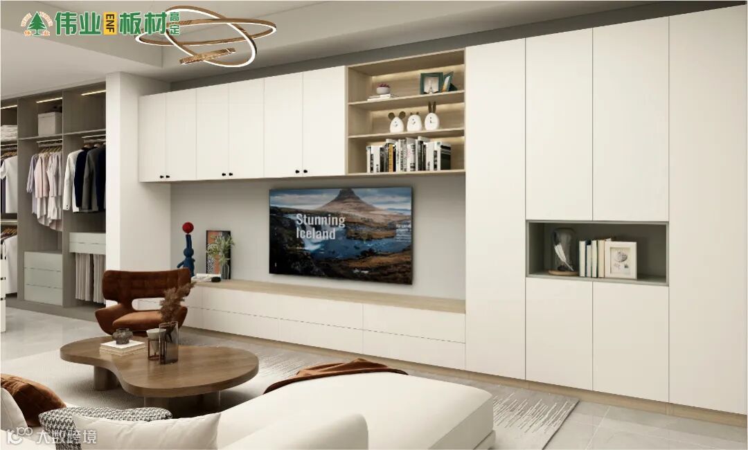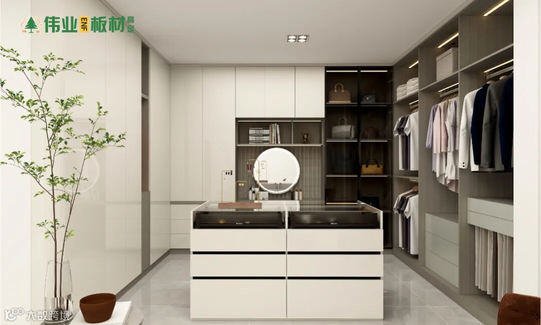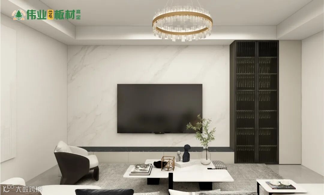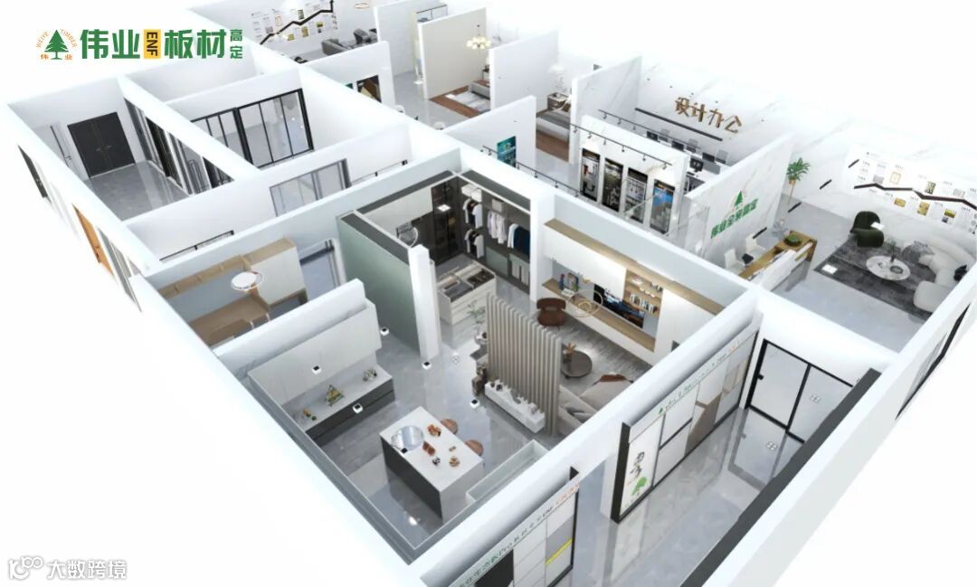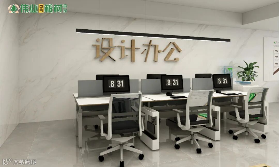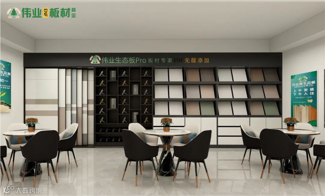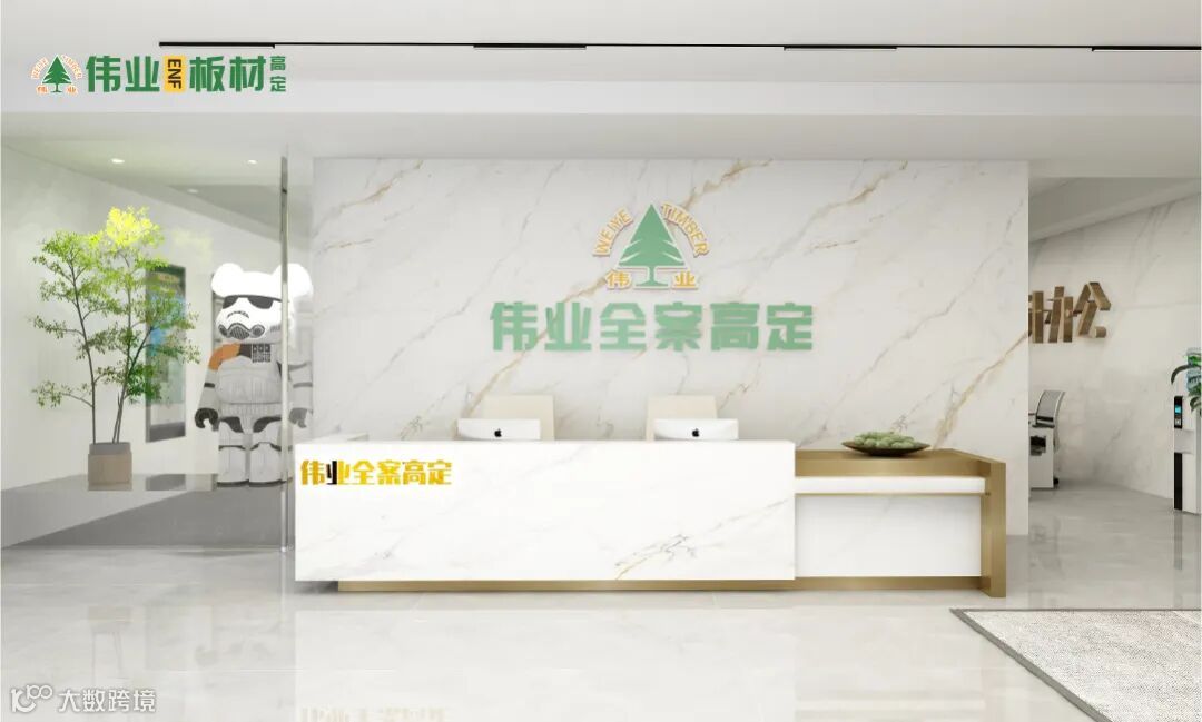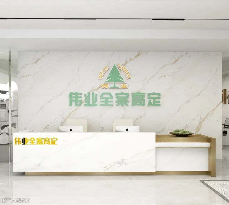 前台是岩纹背景墙+绿色“伟业全案高定”logo,给人强烈的视觉冲击力,在方寸之间,展出伟业的面貌和格调。