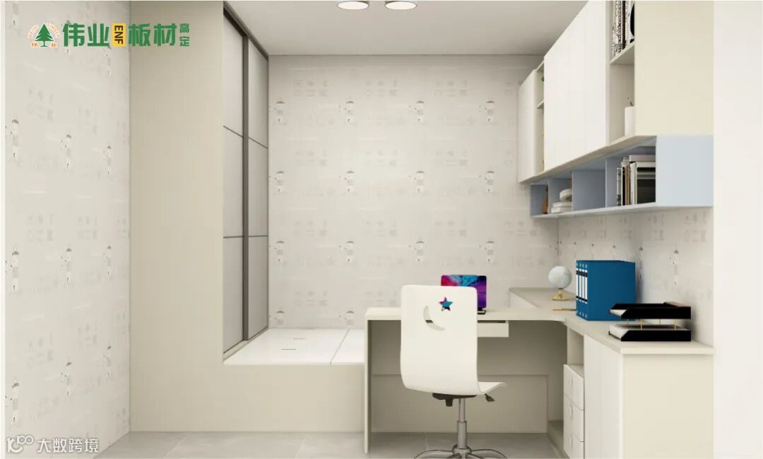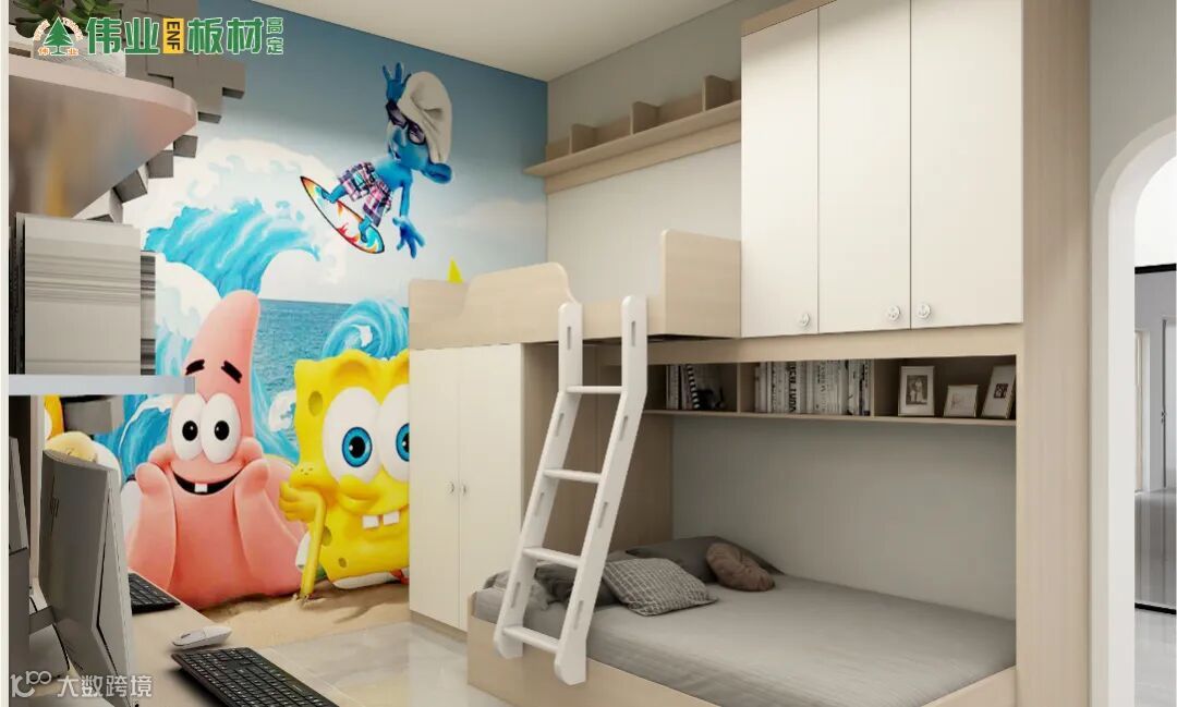 儿童房是上下床,上床尾增加收纳柜,下床里侧增加书柜,在紧凑的空间,创造更多收纳空间。双人学习桌,完美满足二宝家庭。