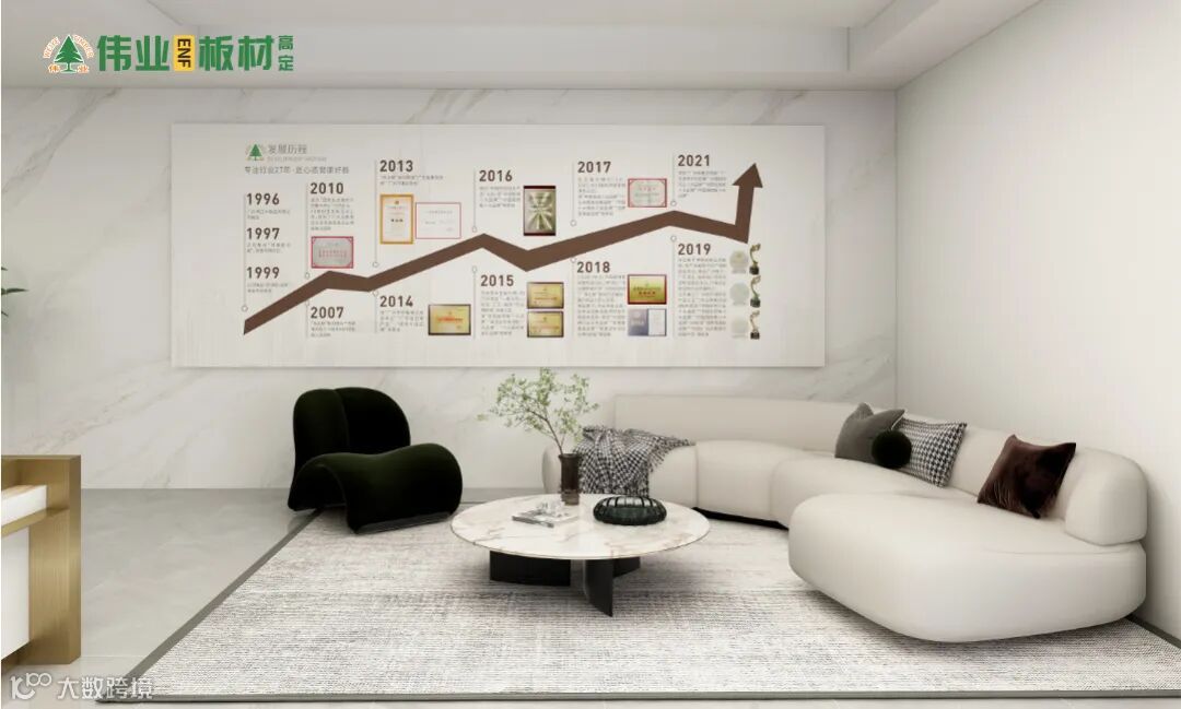 前台一侧做接待区,墙面打造伟业发展历程图,让意向客户更加了解品牌。