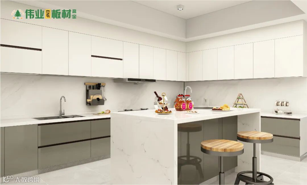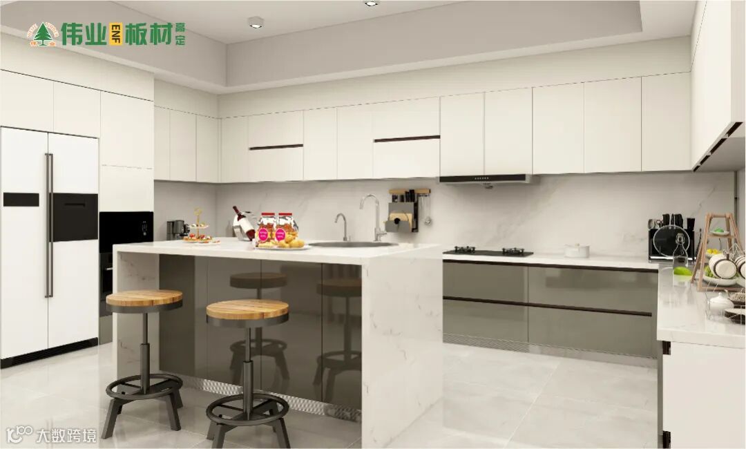 多功能开放式厨房,L型+中岛台的设计,触发了视觉的延伸感,白色+灰色的色彩搭配,打造出干净利落的空间层次,让烹饪美食也成为一种优雅的享受。