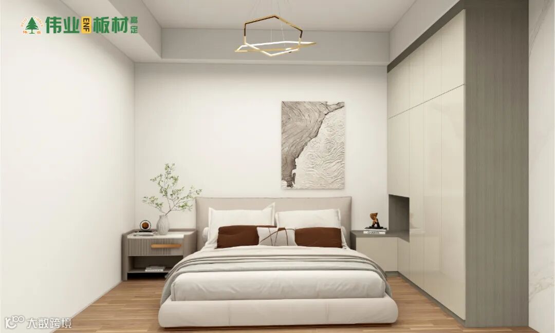 卧室主打极简风格,一床一柜一挂画,不着痕迹地将空间化繁为简。在灰白的基础上,一株绿植的点缀,塑造出了淡雅又富有诗意的空间氛围。