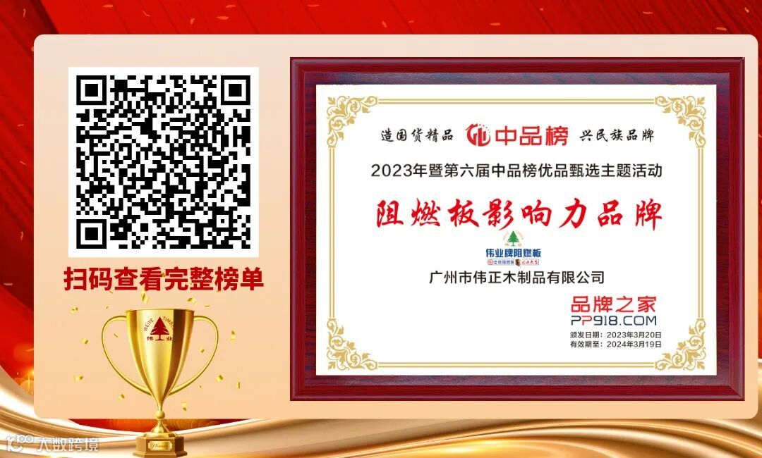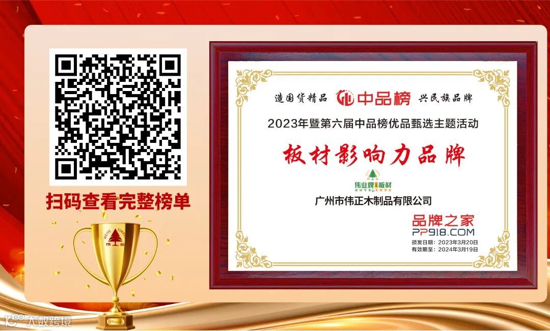 日前,品牌之家主办的造国货精品,兴民族品牌|2023年暨第六届中品榜优品甄选主题活动圆满落幕,伟业牌板材连登两大榜单,斩获“板材十大影响力品牌”、“阻燃板十大影响力品牌”双项殊荣,是对品牌实力与市场影响力的最好见证!