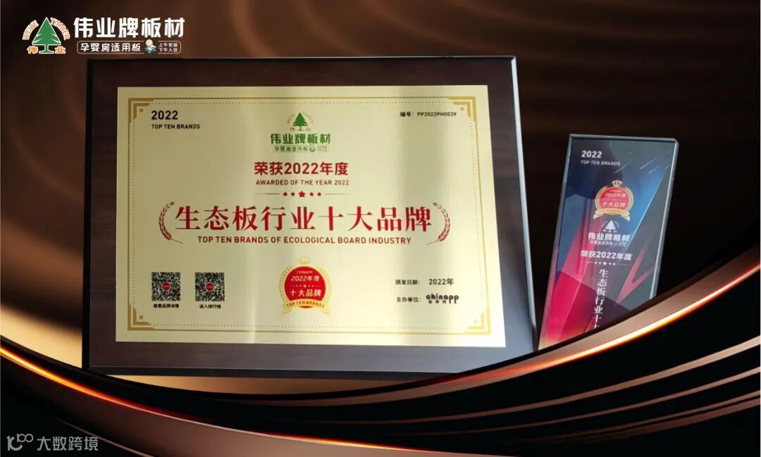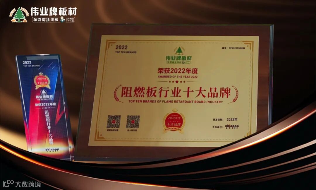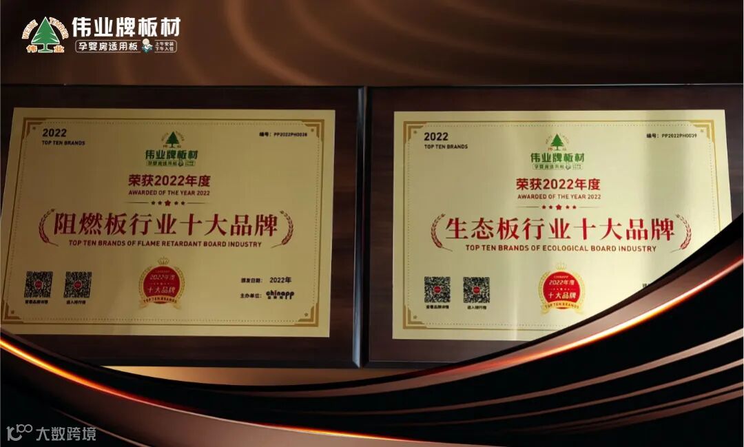 近日,由品牌网主办的“2022年度十大品牌”评选活动正式发榜,伟业牌板材一举斩获“生态板行业十大品牌”、“阻燃板行业十大品牌”两项重量级大奖!