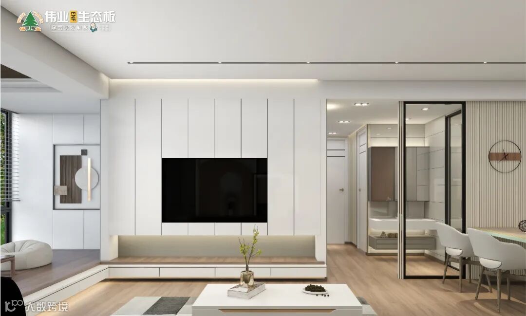 整墙收纳柜+底部留空,塑造出极简风的电视柜,电视机嵌进凹位,整体没有复杂的堆砌,一切都简洁明了,通过大量的留白,给生活创造无限可能性。