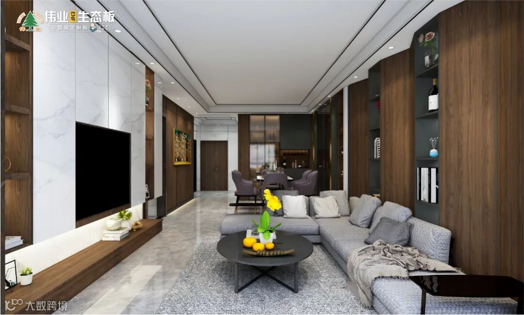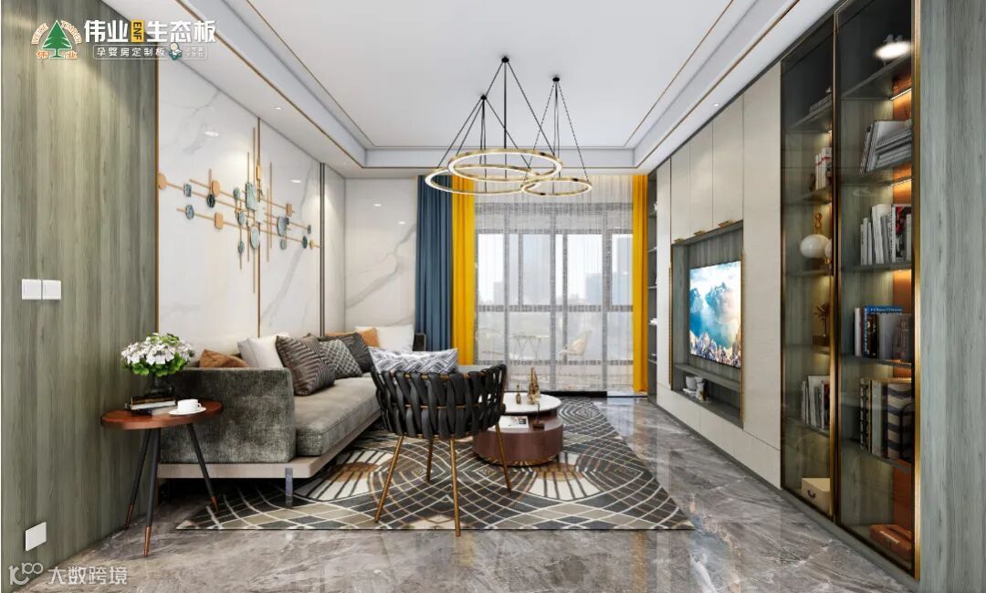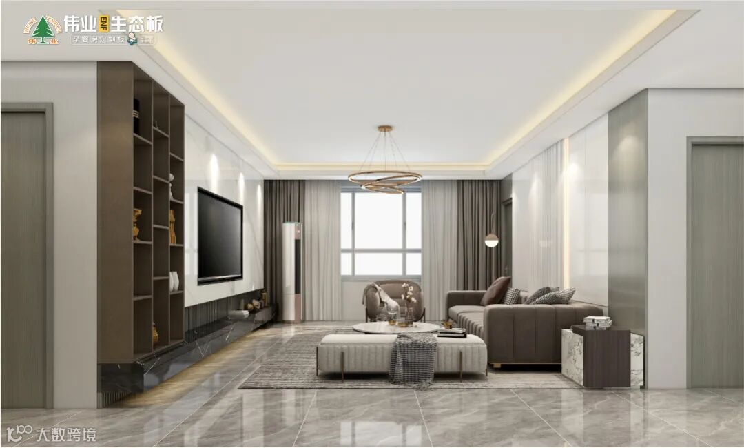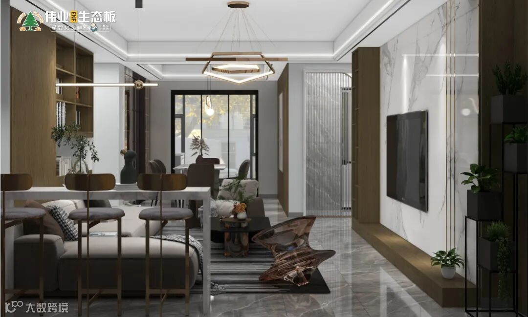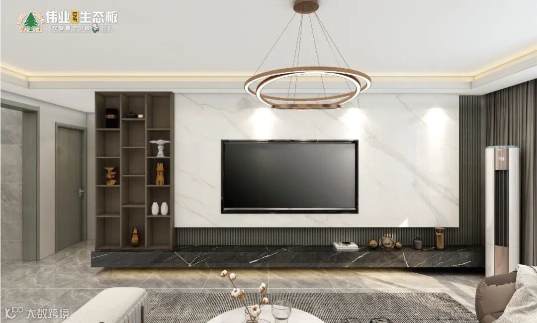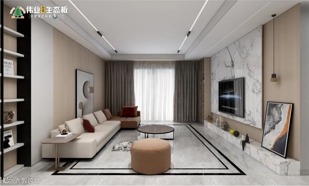 拒绝复杂,L型装饰柜+岩面电视墙+金属装饰线,电视机居中摆放,简洁大方,构建极美的视觉感,用最少设计的表达,给予居住者更多的想象空间。