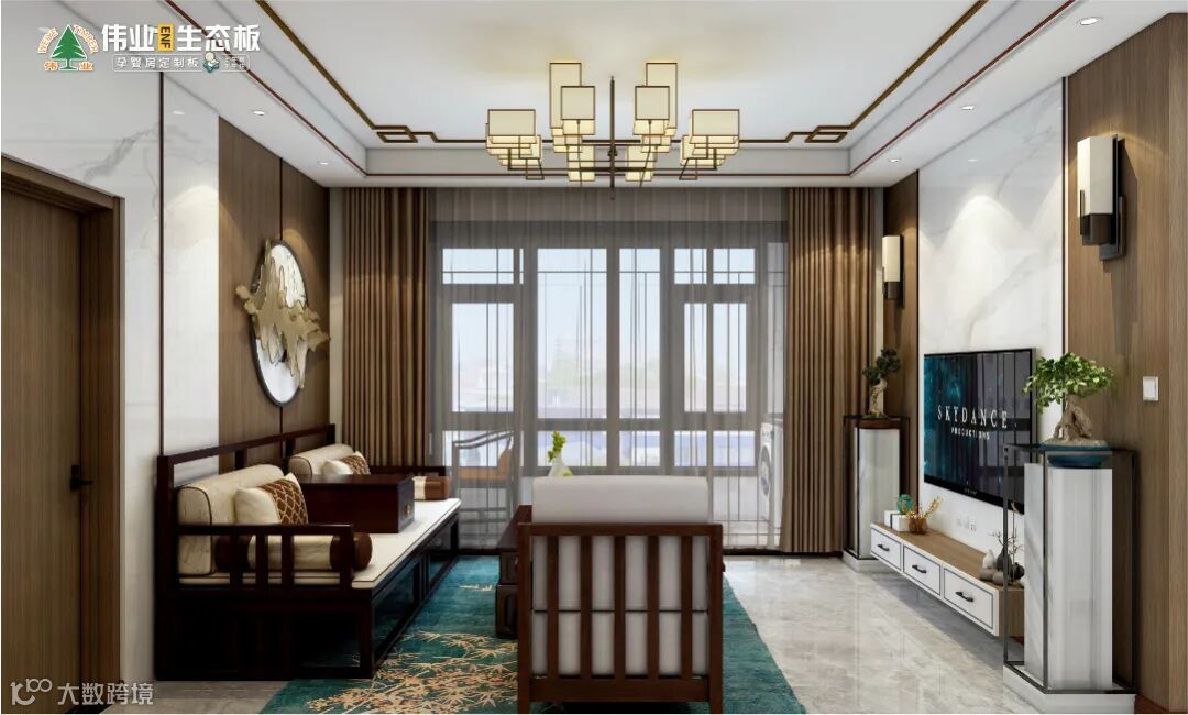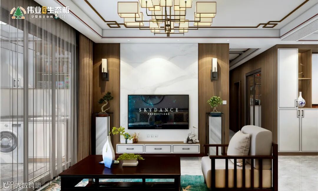 电视柜没有浮夸、压抑的元素,质朴的花色、精致的纹理,营造出新中式的色彩碰撞,恰到好处的东方风情和简洁设计手法的结合,整个空间清雅含蓄、大气凝远。