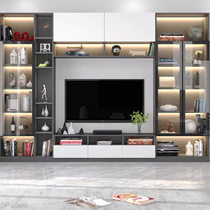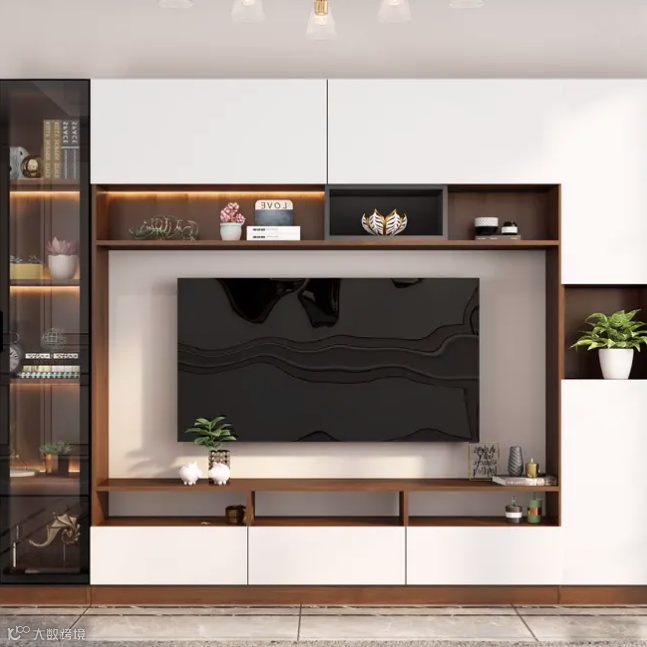 一体化电视柜纵向拔高、横向开阔,灯带是开放格和下方镂空的“神助攻”,橘黄的灯光和黄桃的花色相映成趣,让柜体彻底“丢掉”厚重感,整体更加轻盈灵动。