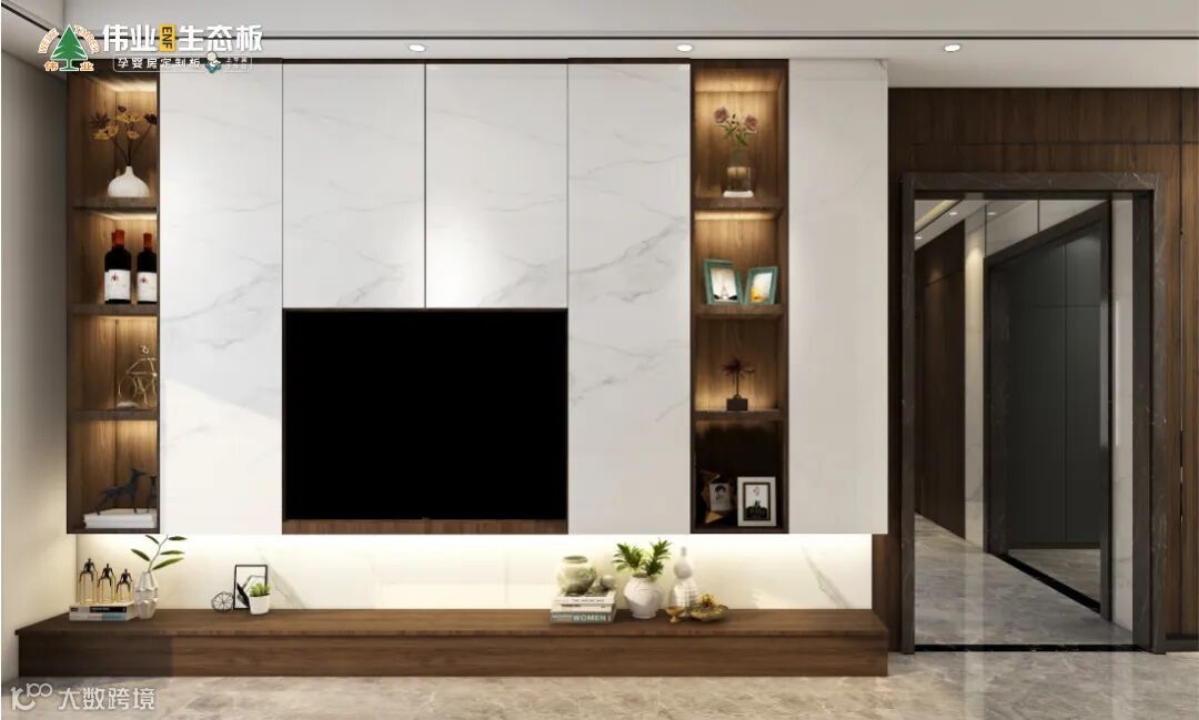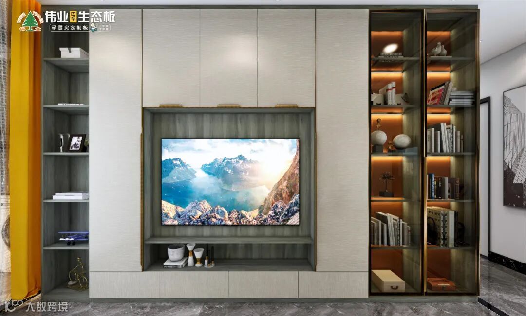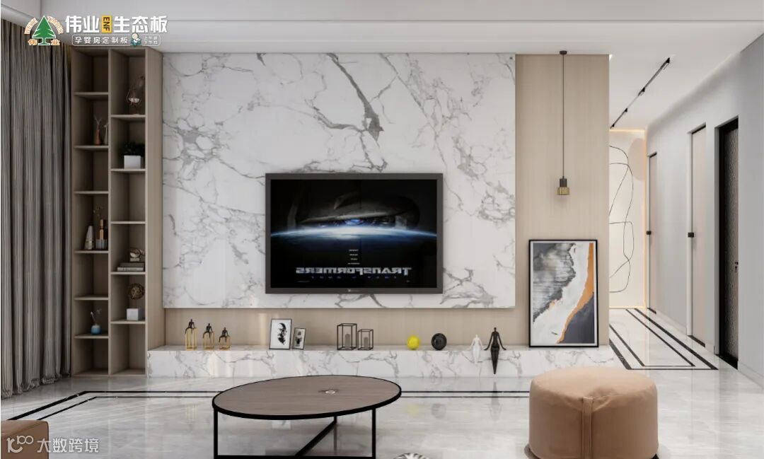 电视柜呈回型布局,两侧做非对称展示柜,展示柜加入浪漫的爱马仕橙做背板,嵌入暖色光源,瞬间高级感满满,彰显轻奢风的精致与格调。