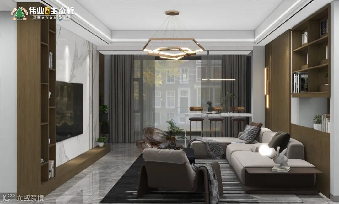 “原木色+岩面”组成电视墙,原木色的柔和,完美中和岩面的粗粝感。在地台的基础上,增加收纳格、L型镂空设计,摆上装饰品、艺术画,轻松营造文艺气息。