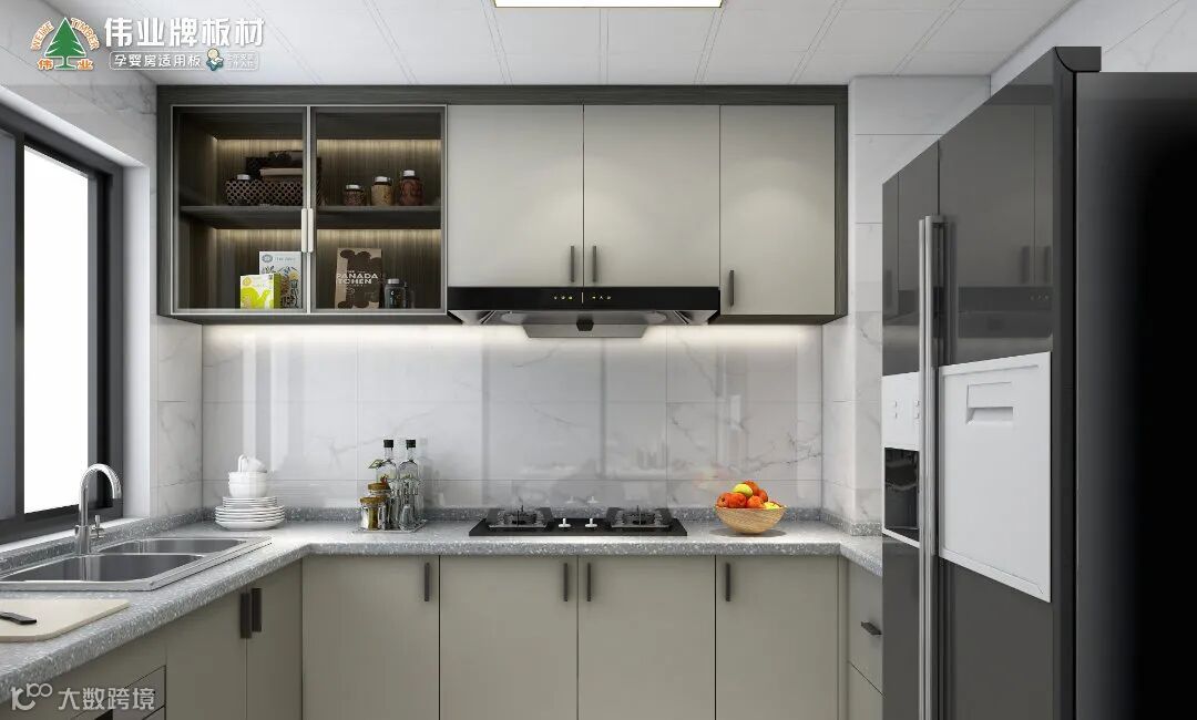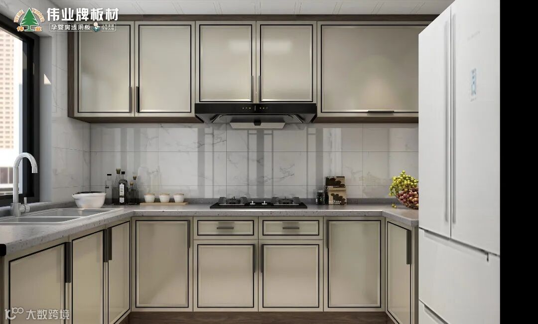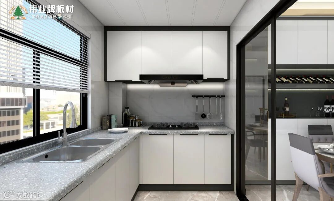 很多户型厨房面积不大,玻璃具有通透感,不妨加入吊柜或整体玻璃柜门设计,既卸掉了木质橱柜的沉重感,又让收纳物品一目了然,让小面积的厨房更显开阔、颜值更高。