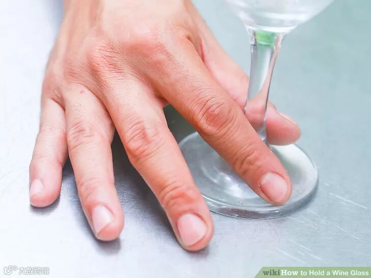 如果品酒时有桌椅,也可以将杯子放在桌上,只用拇指和食指夹住杯柱。这种持杯方式可以方便品酒者快速而稳定地摇杯。