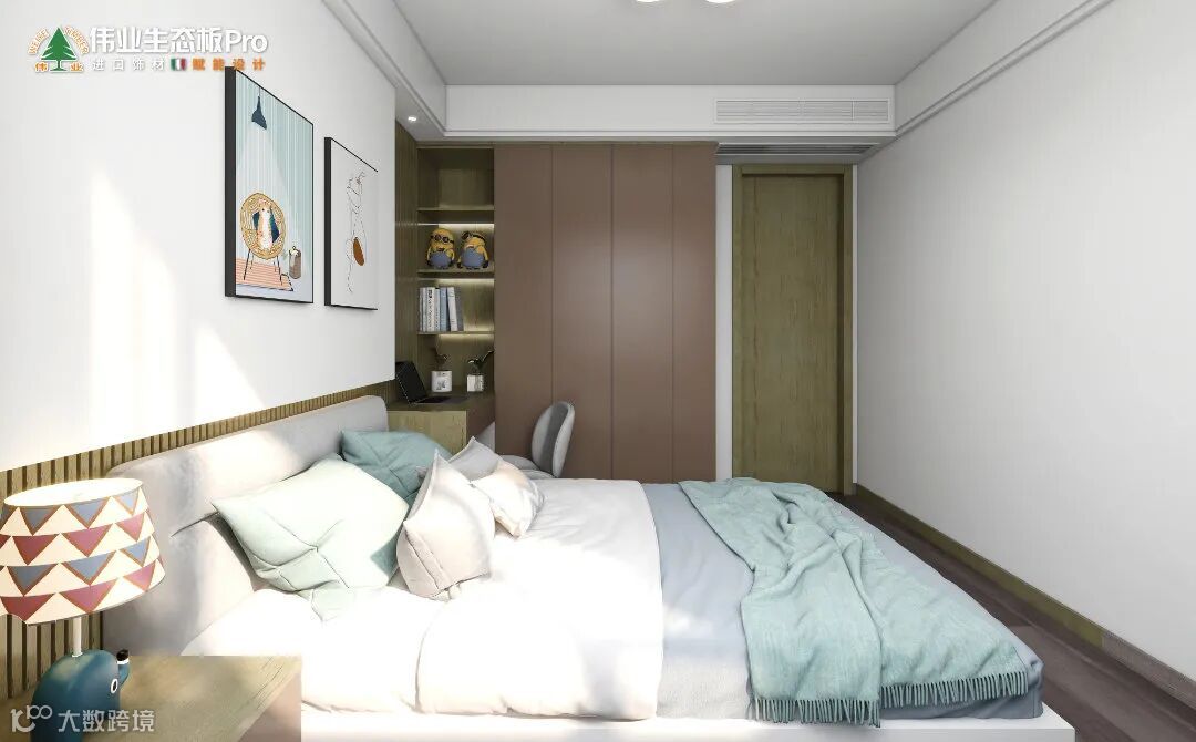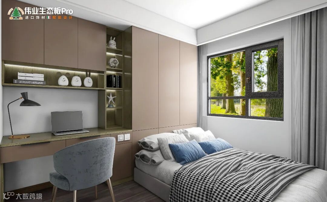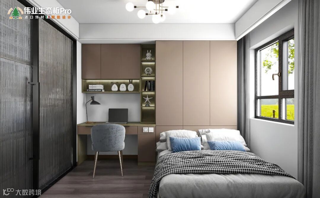 多功能房以办公+休息为主,贴墙定制一体化柜体,封闭收纳柜直接做床头墙,中间的开放收纳层过渡,书桌+吊柜,满足办公和收纳需求,靠窗摆放床具,不影响采光。