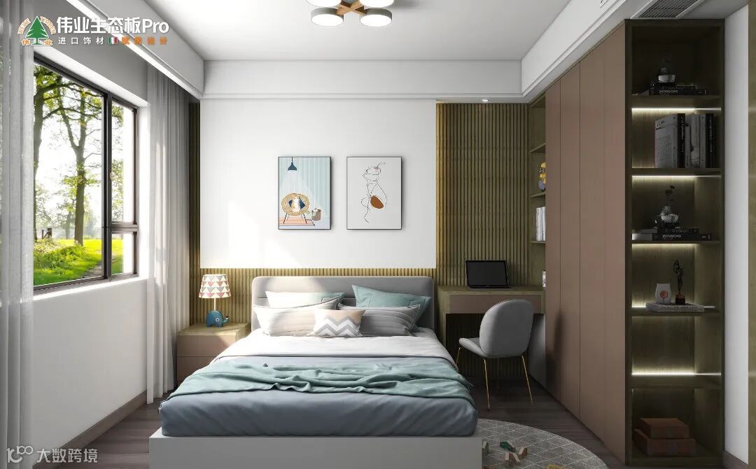 儿童房精心布置,挂画+不规则背景墙,童趣满分,床侧嵌入到顶衣柜,开放格+书桌,开辟出学习小天地,衣柜末端做开放薄柜设计,让书籍、工艺品一一归位。