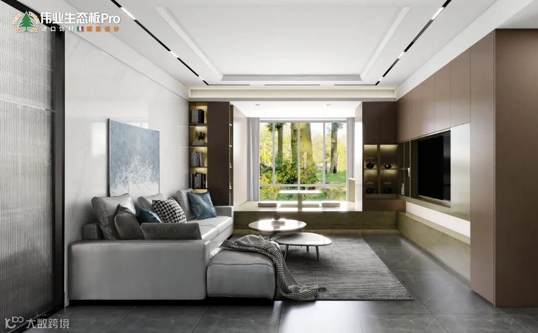 客厅和阳台相连,地台+升降榻榻米,营造休闲一角。整体以极简的形态、时尚的色彩、现代的元素,构成空间主体,将理想中诗和远方,全都铺陈在空间之中。