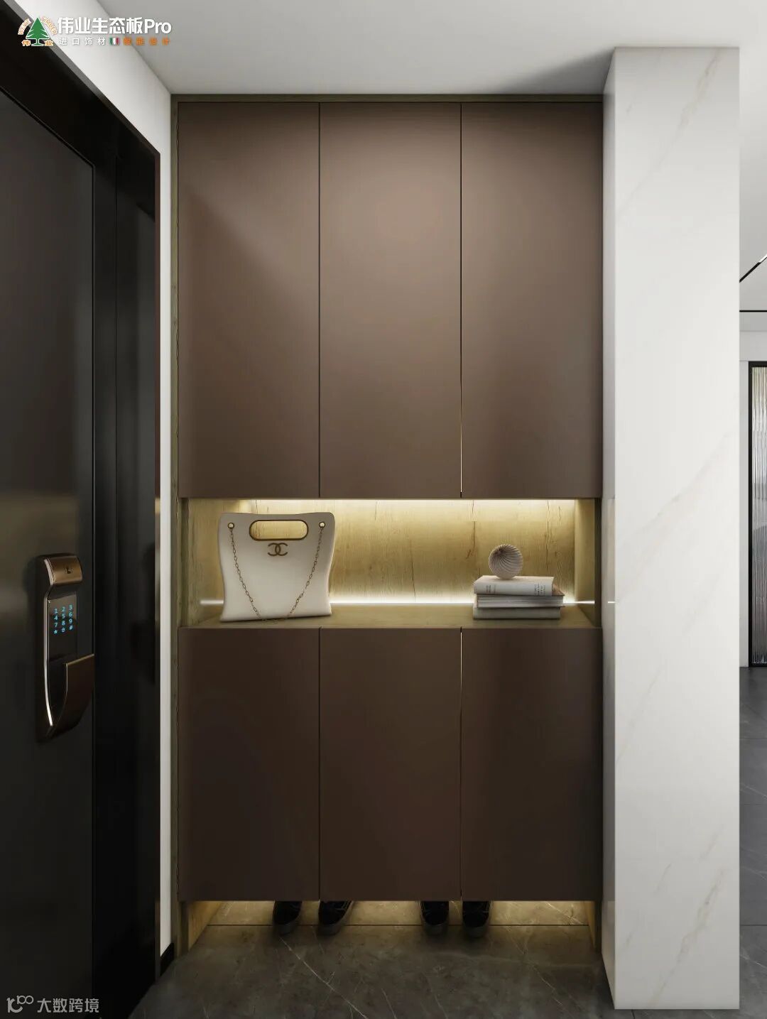 入户做通顶玄关柜,以木元素为主导,铺设出素简、立体的空间肌理。玄关柜的中间镂空、底下悬空,嵌入灯带,在视觉上营造出层次丰富的穿透感。