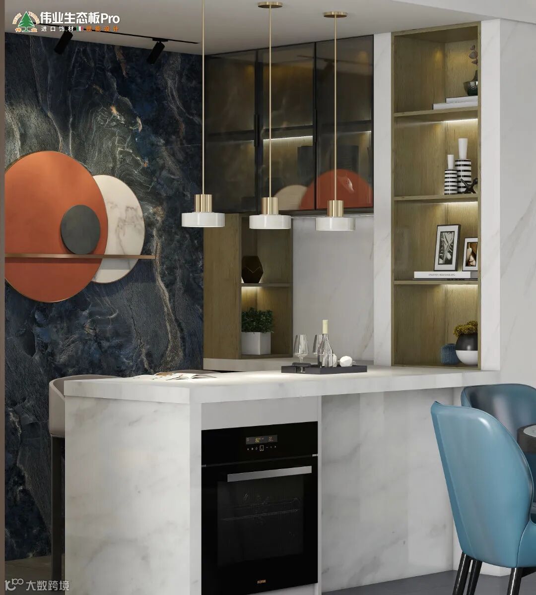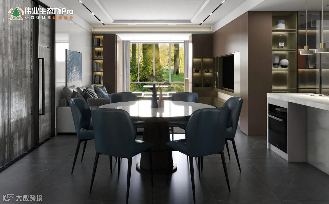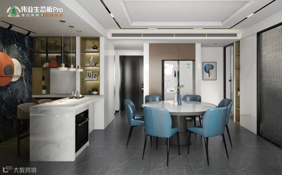 餐厅增加社交西厨,设计收纳柜+岛台,满足煮咖啡、烘焙等操作需求,让家的空间发挥更多可能性。