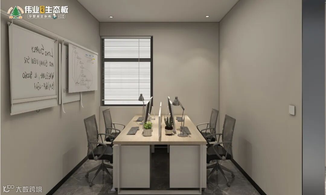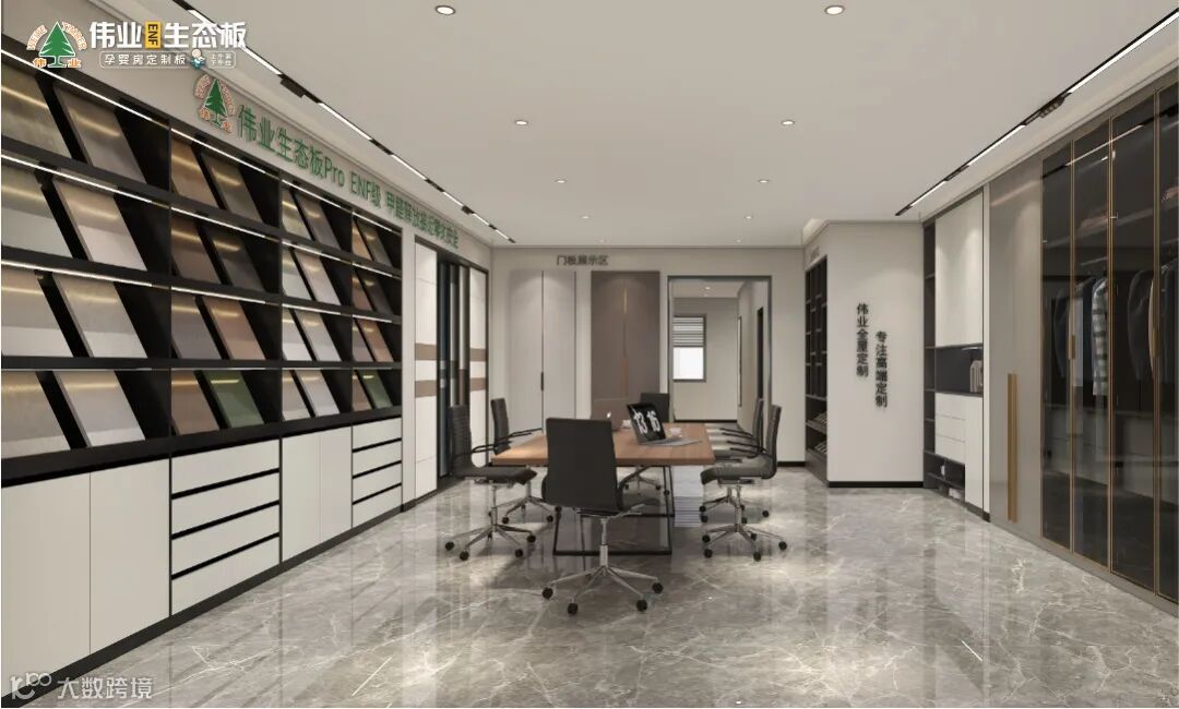 沿墙做L型展示区,分别展示最新的小板花色、常规柜门、一门到顶柜门,中间放置办公桌椅,形成接待洽谈区,大大提升展厅空间利用率。