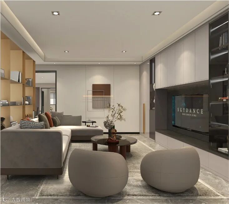 用装饰柜和厨房分隔,整体电视柜以沉稳色系为主,开合结构,满足展示和储物功能。灰调的沙发、高低错落的茶几,不规则的几何造型,不同色块的拼接,使空间富有张力,时尚而有格调。