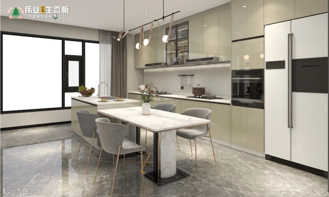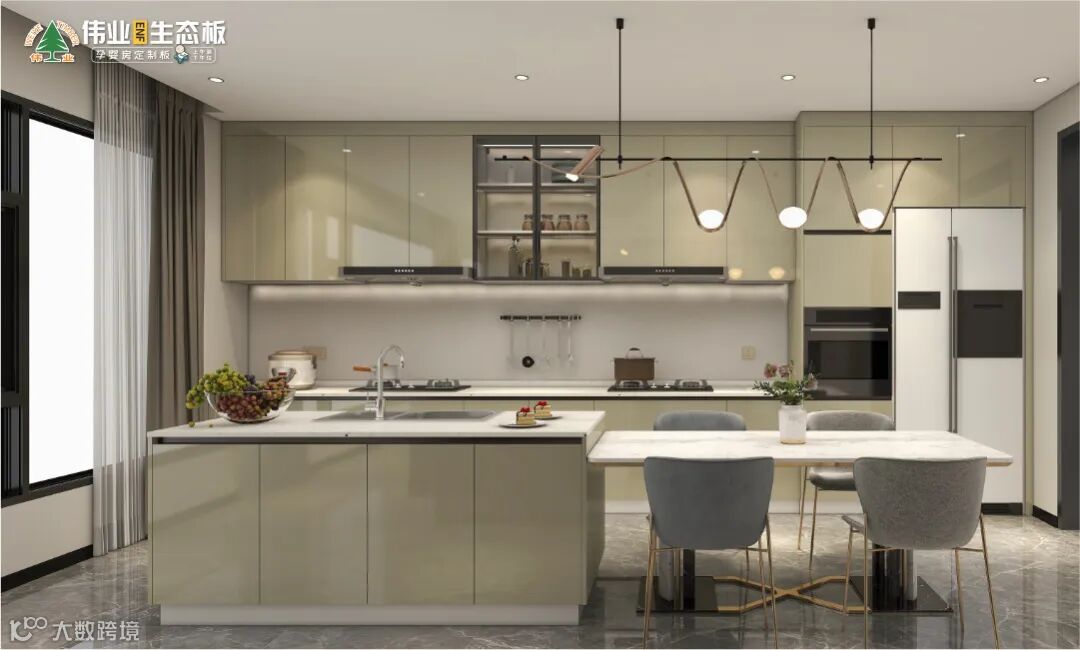 一字型橱柜,纵向划分“洗-切-炒”操作动线,引入潮流的“餐桌+岛台”设计,联合条状吊灯,合力打造轻奢的浪漫氛围,高效的空间利用、统一的质感,让餐厨空间更加高端大气。
