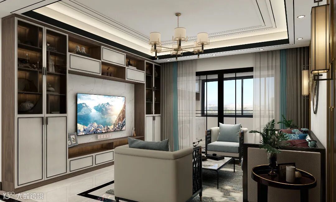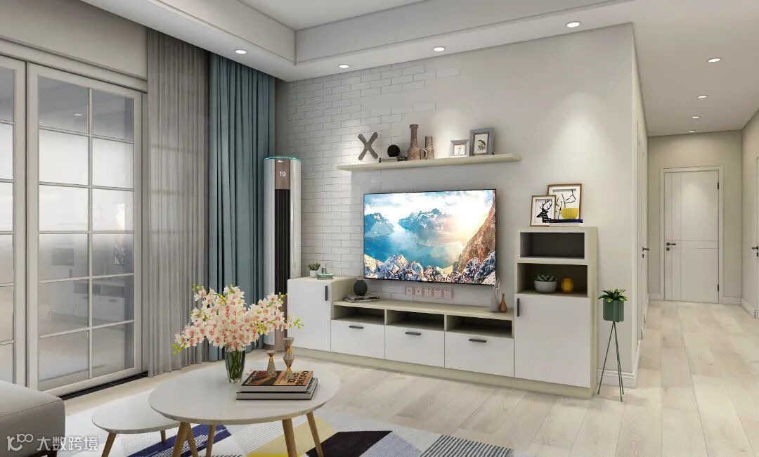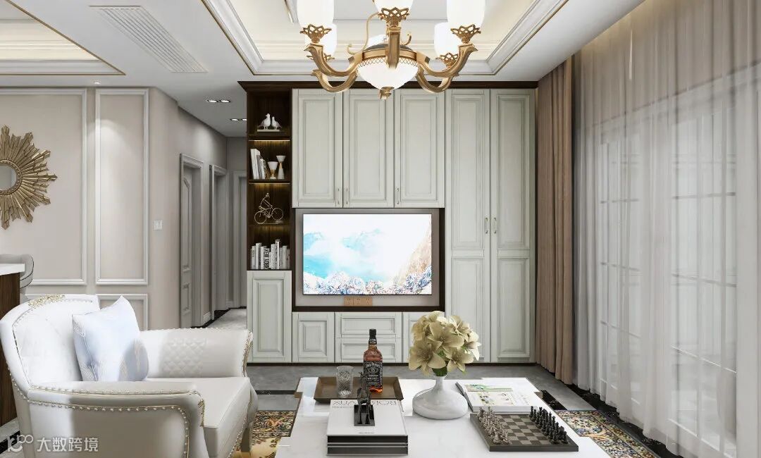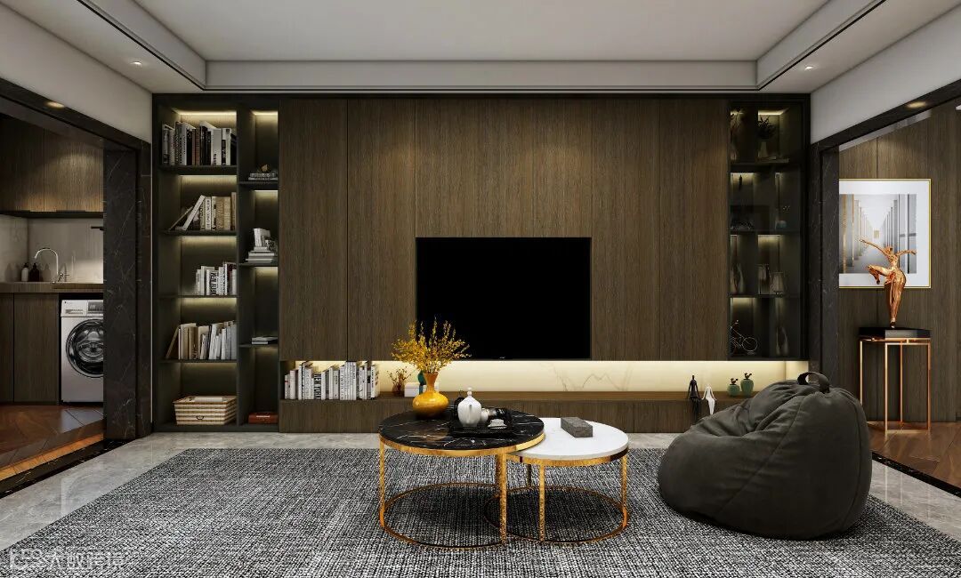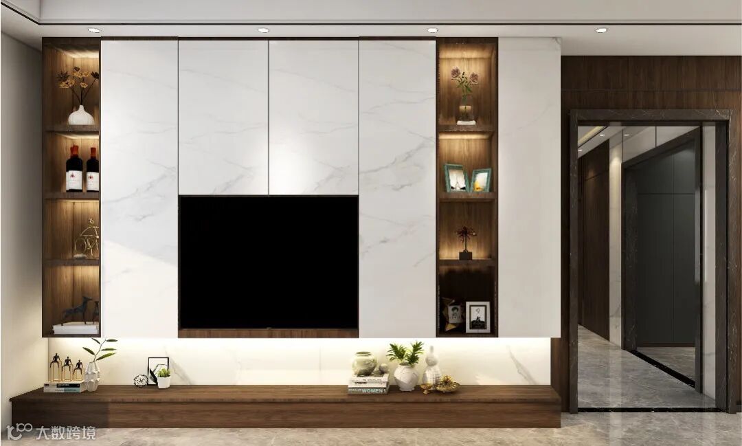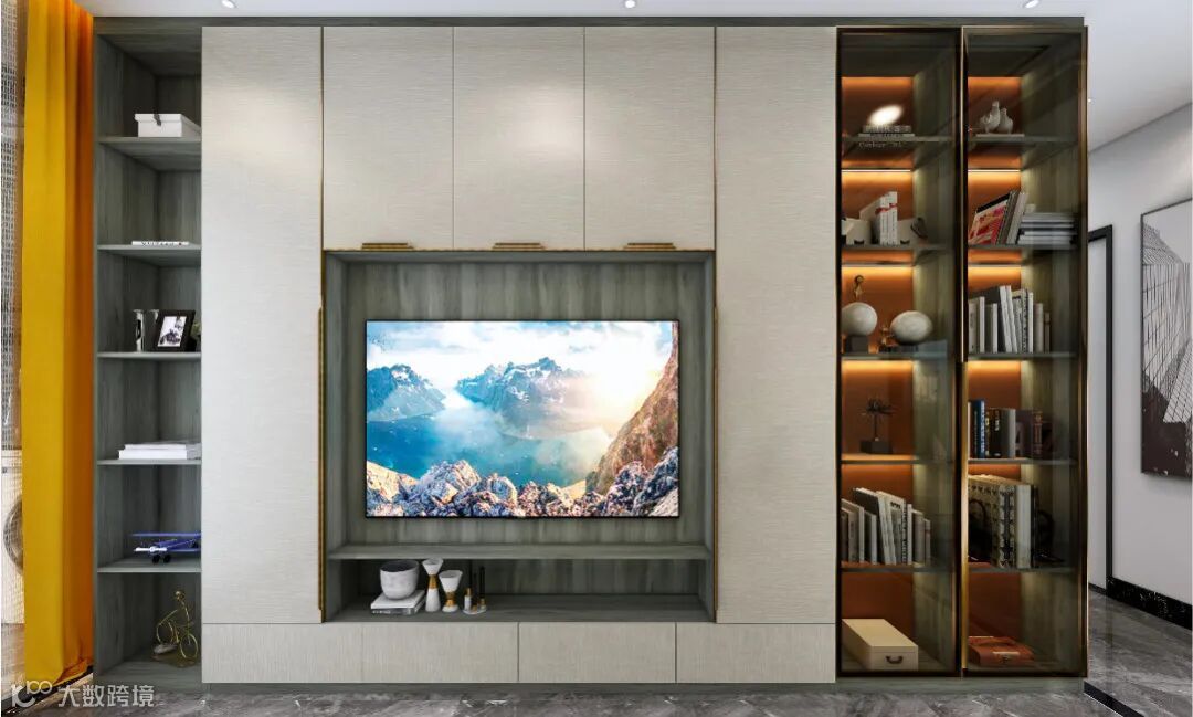 以电视为中心,利用组合的形式,灵活搭配层板、封闭格、展示格,极大丰富了收纳形态,呈现造型多变、高低起伏、错落有致的特点,提升视觉跃动感,让空间质感更饱满。
