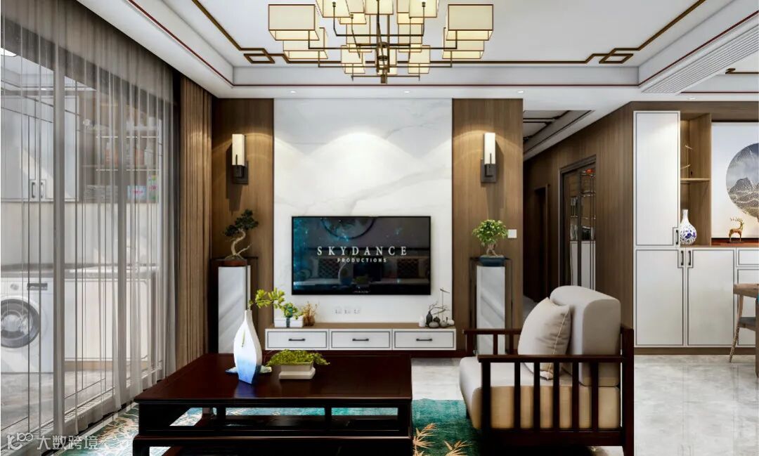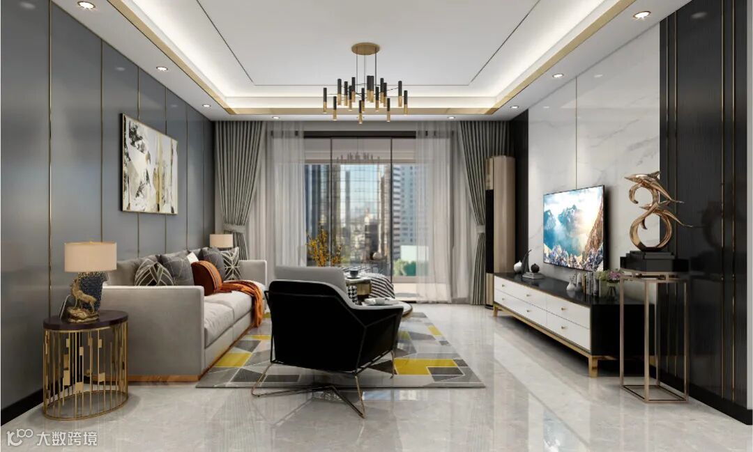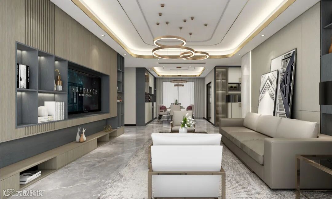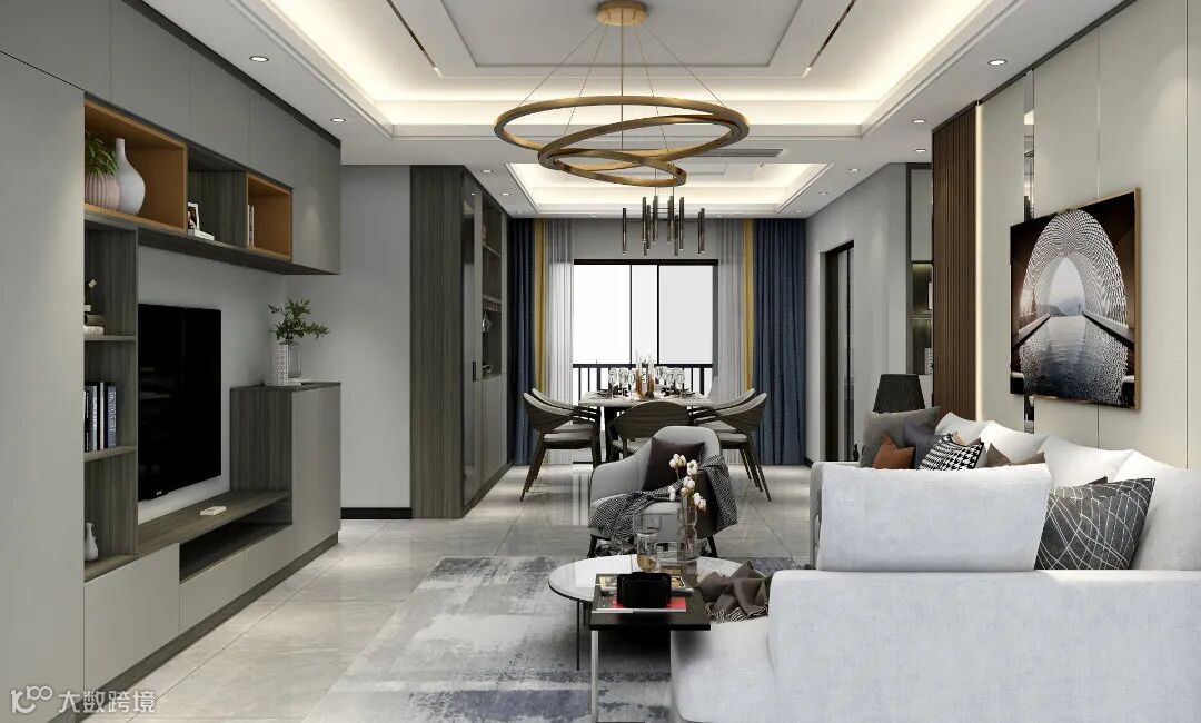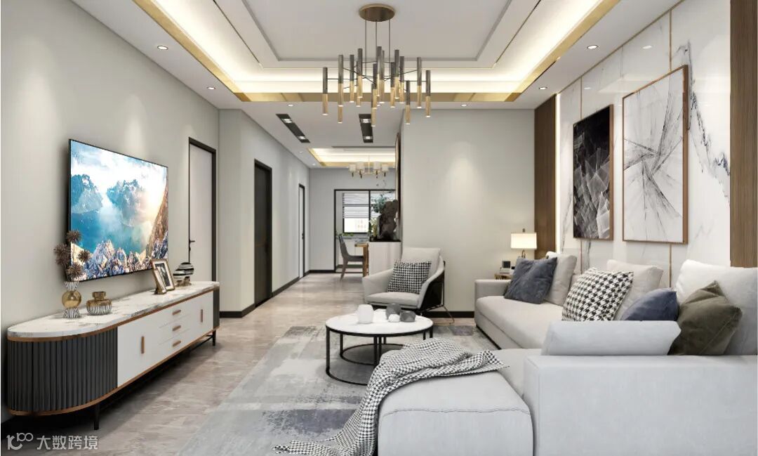 整墙电视柜把电视居中内嵌,保证观影效果,柜体藏露结合,展示区摆放书籍、工艺品,为客厅增添艺术气息,下方做悬空展示设计,搭配灯带设计,营造出轻盈简约的美感。
