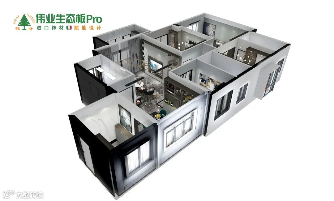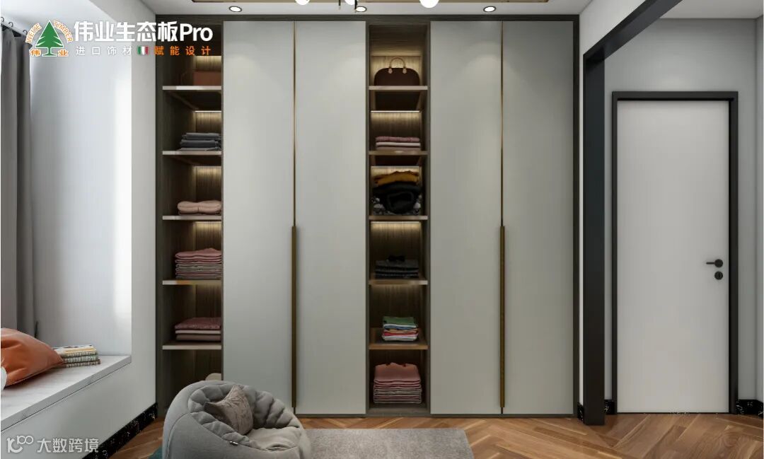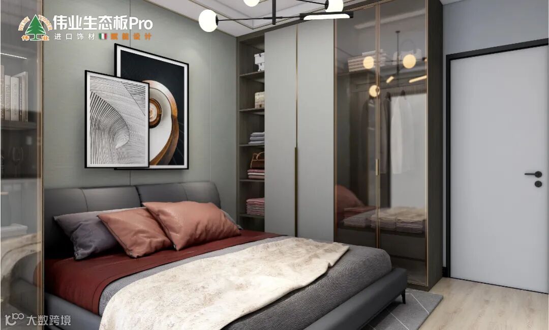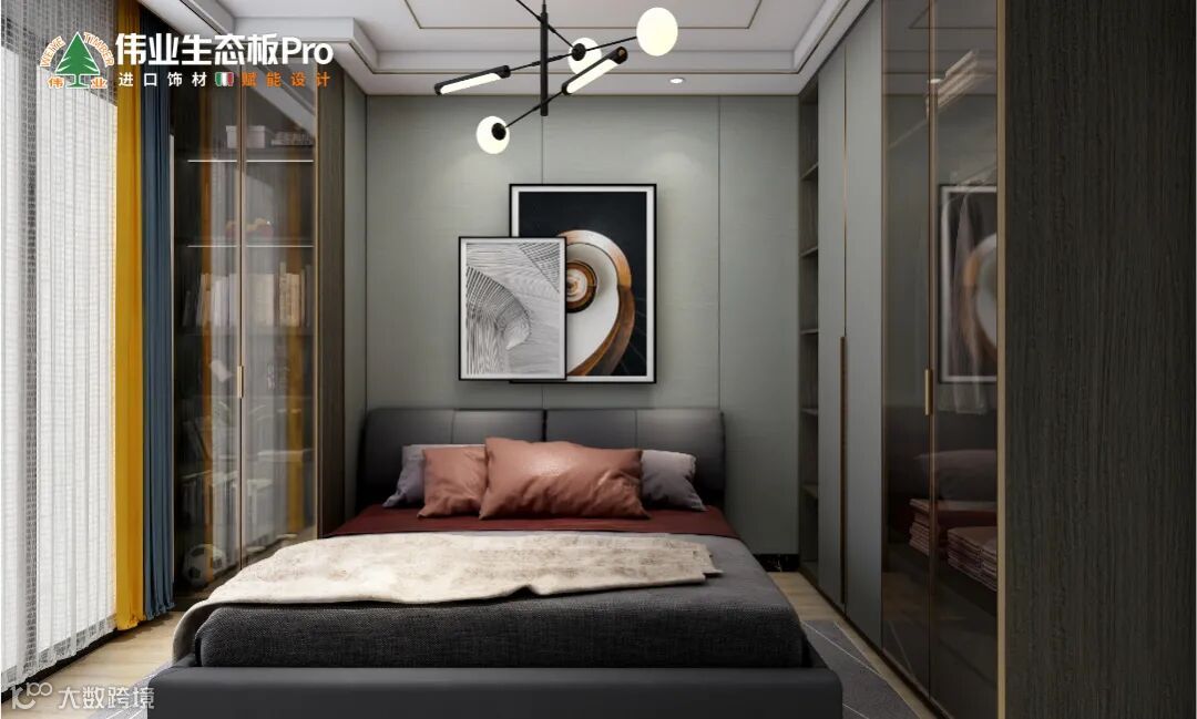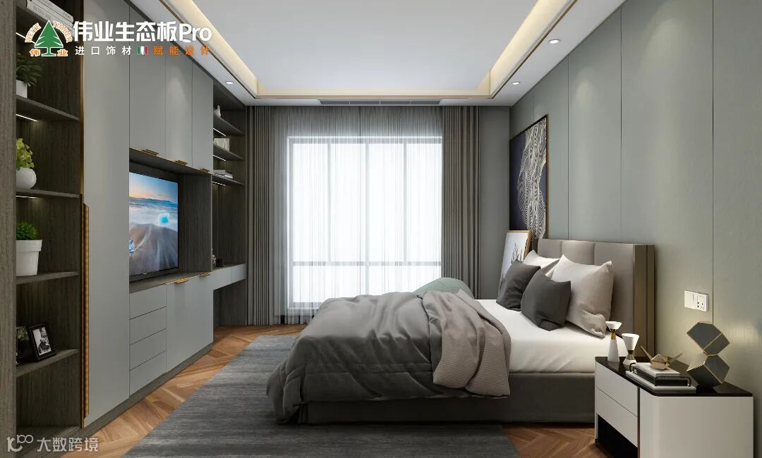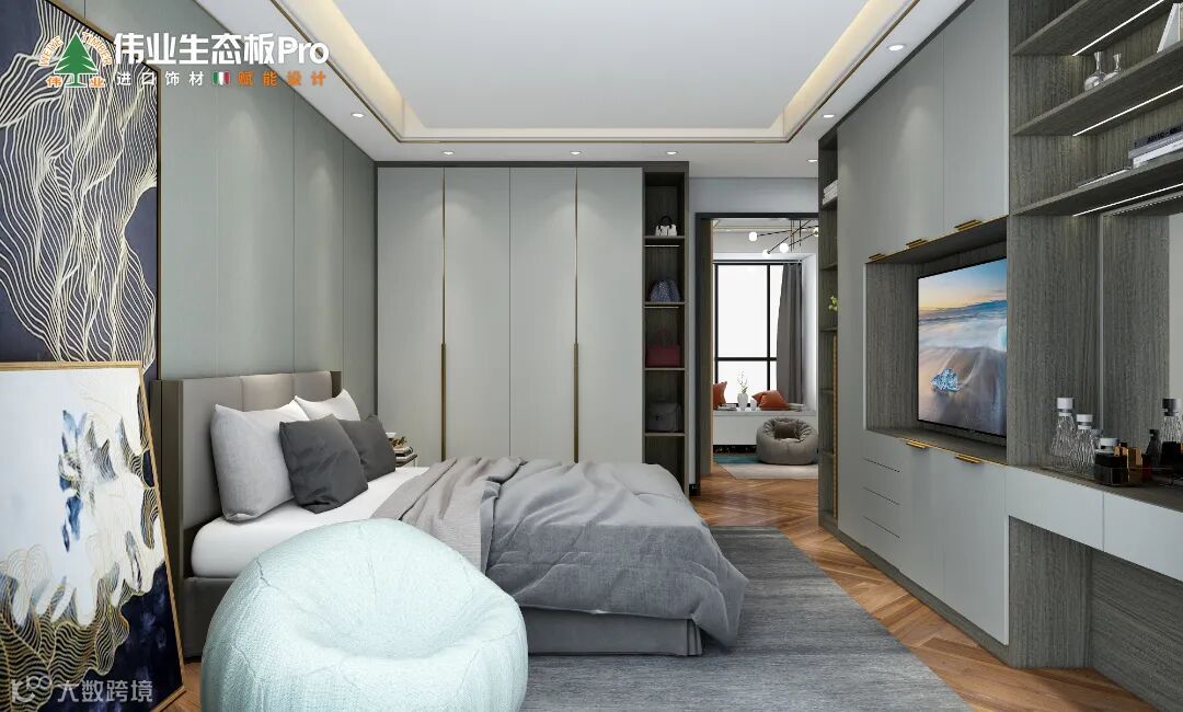 主卧的配色倾向于闲适与放松,低饱和度的中性灰色调,将整个空间串联起来,到顶电视柜蕴含收纳、展示、梳妆多种功能,衣柜、衣帽间则成为储物主力军,床侧放置装饰画,既弥补空间用色的单调性,又让休憩空间更添几分艺术意境。
