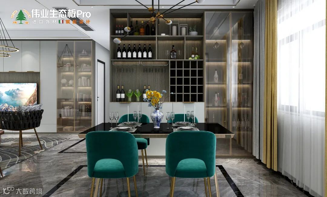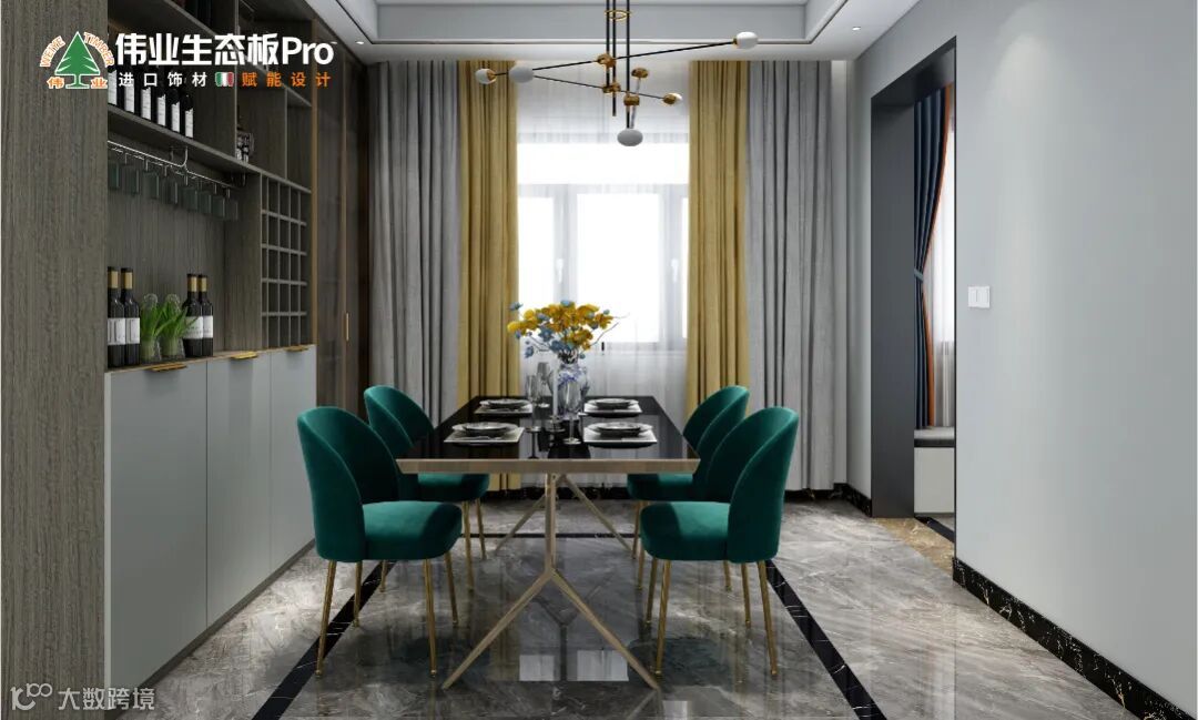 玄关进来是餐厅,整墙式餐边柜+酒柜设计,把每一寸空间利用到极致,整体用色高级,布局精致,线条简约流畅,加之吊灯、桌脚等金属元素,色彩对比强烈,给人精致大气的视觉冲击感。