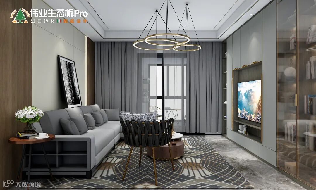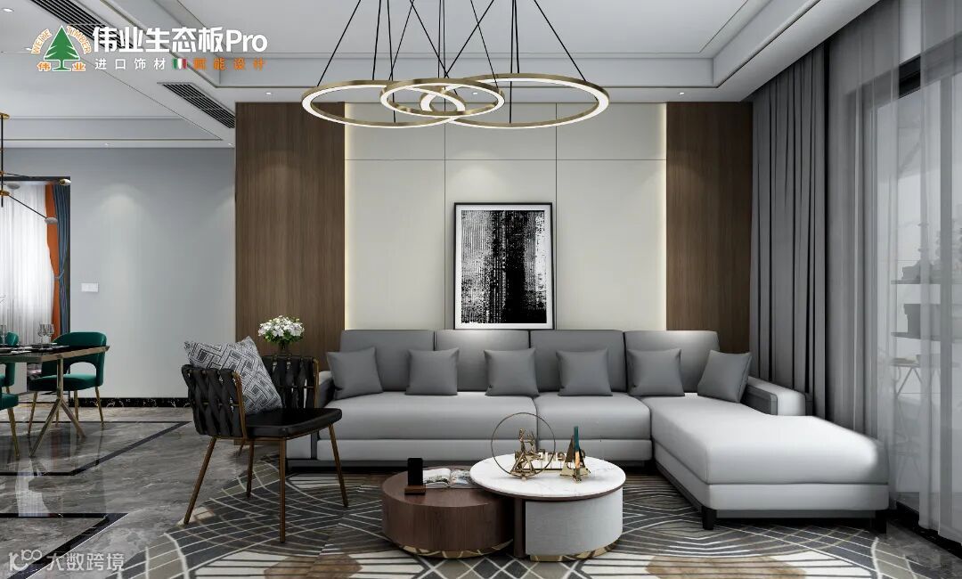 步入客厅,以灰调为基地,沿着墙面砌打造兼具收纳、展示功能的电视柜,呈现理性和优雅之美,引入木纹+布纹做沙发背景墙、L型皮质沙发,借由不同材质肌理平衡空间的冷峻感,整体简单大气颜值高。