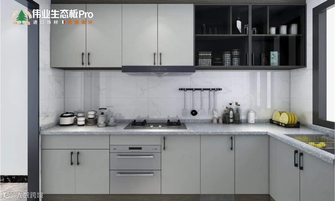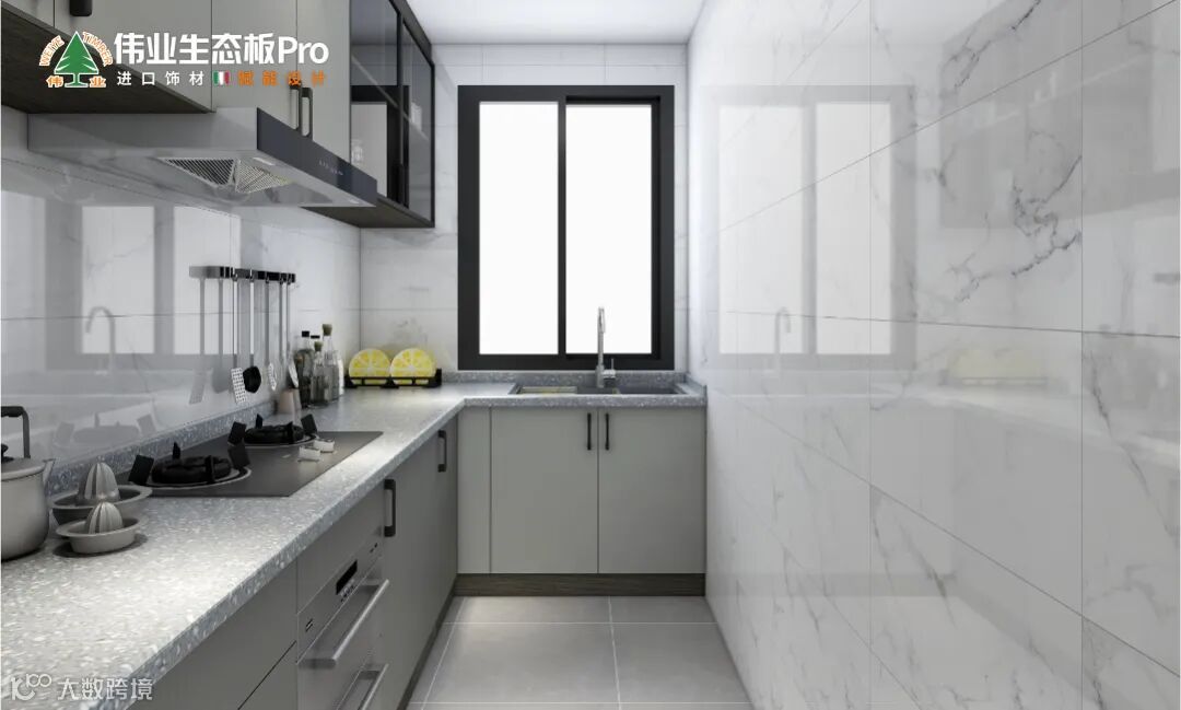 长廊型的厨房设计成L型橱柜,打造水槽-操作台-灶台的布局,横向拓展料理动线,整体灰色调的橱柜,耐看又耐脏,搭配黑色金属拉手,共同打造冷艳轻奢风的厨房。