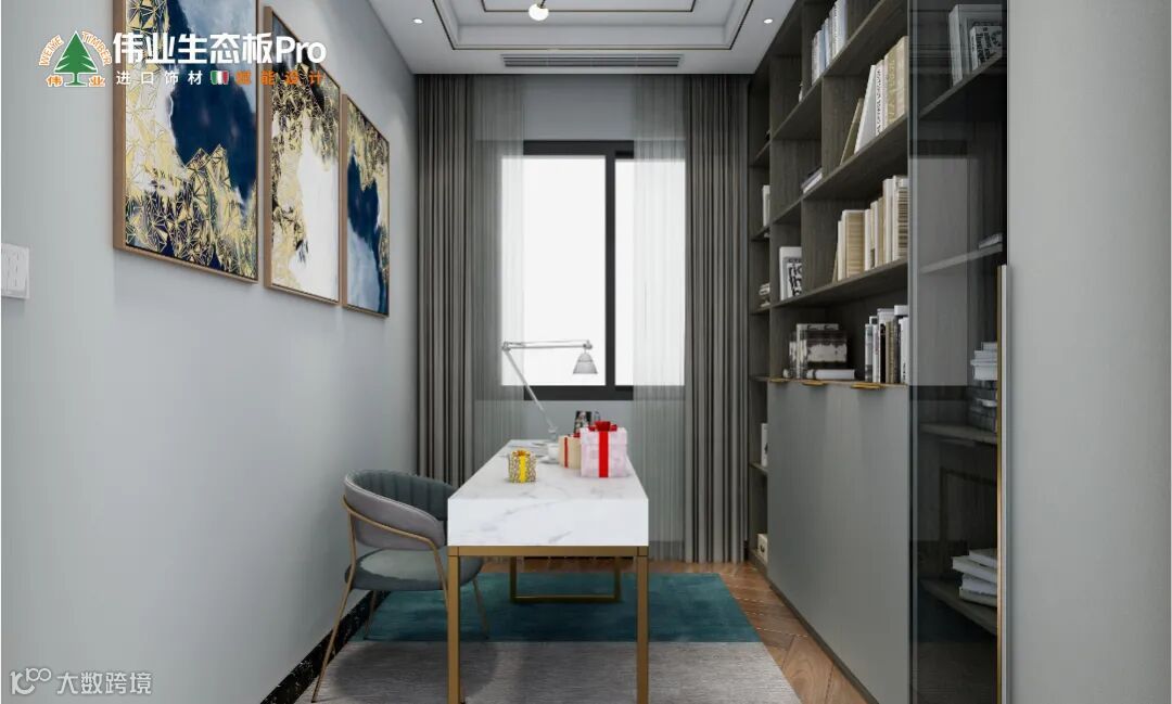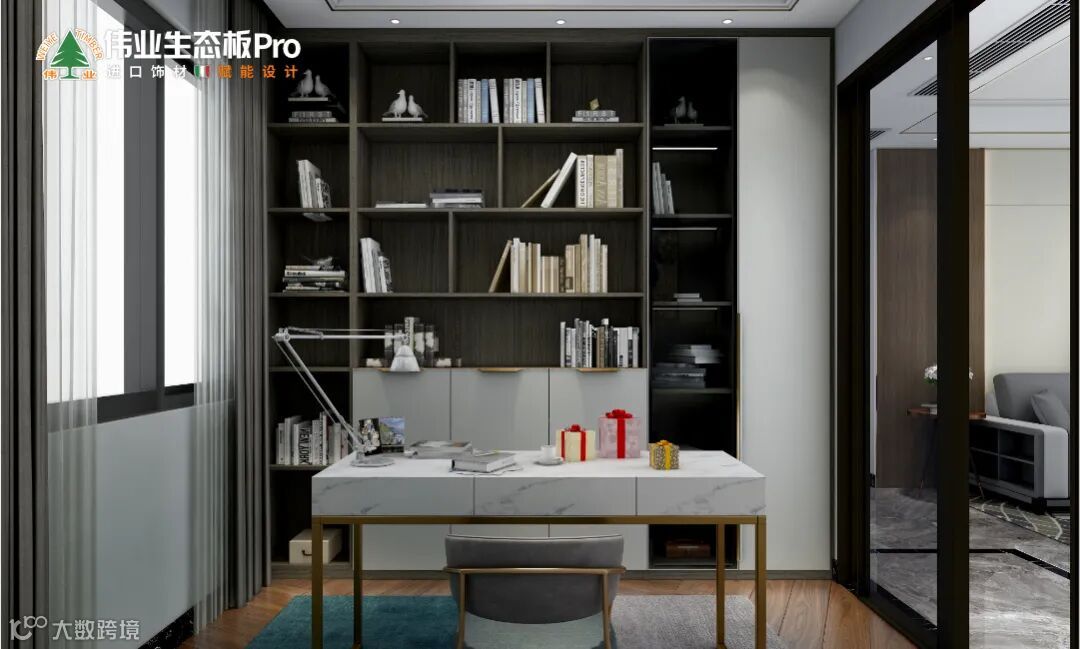 书柜采用嵌入式设计,与空间形成统一,开放式储物格满足书籍、工艺品的收纳需求,中间放置大理石台面办公桌,打造质感十足的办公氛围,让你在工作一天后,卸下一身疲惫与压力,尽情地充实自己。