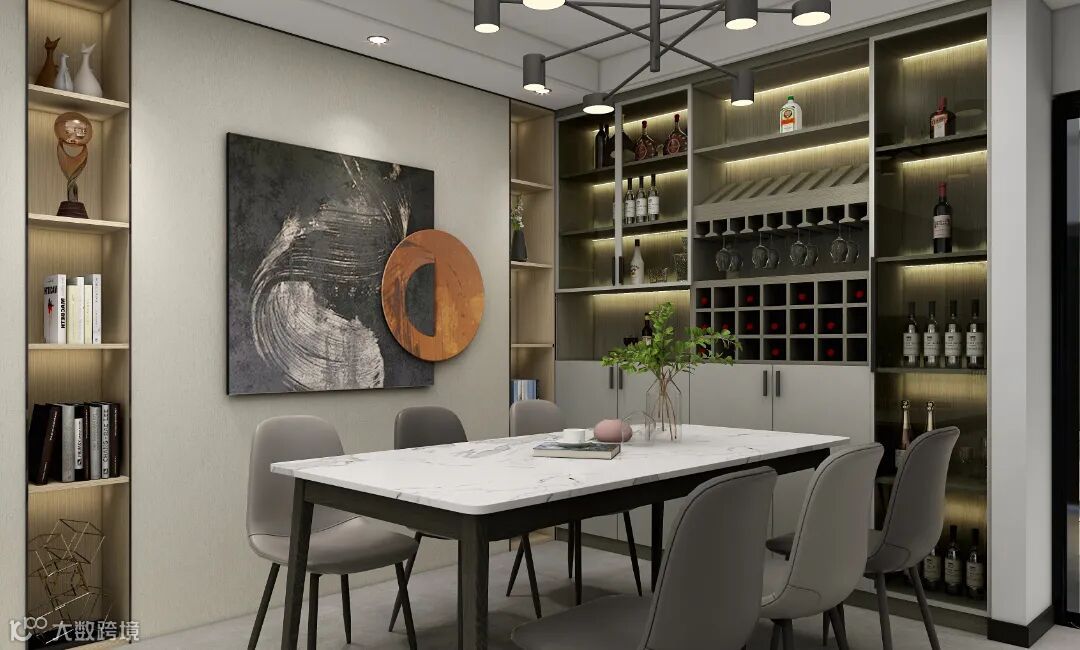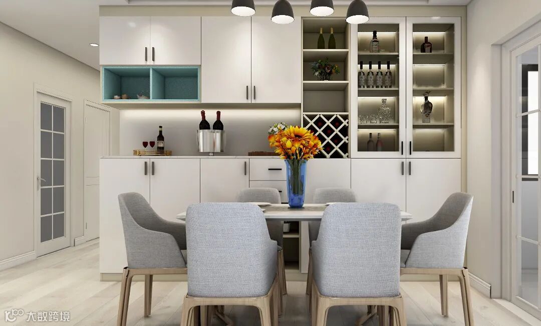 如果储物需求大,定制L型餐边柜是最好的选择,利用餐厅转角空间打造L型餐边柜,集合储酒柜、开放储物格、酒杯架、掩门储物柜等于一身,不经意间将酒品的优雅、餐具的收纳以及装饰品的展示安排妥当。