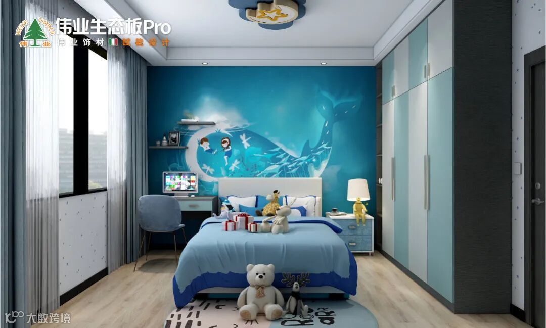 儿童房以蓝色为主打色,柜身是R01锌深灰-染影,柜门是211麻石白火烧+D110淡蓝,蓝白相间、相互依衬,和海洋主题的床头背景墙相呼应,让天真和童趣的气息溢满整个空间,为儿童打造一个温馨、明亮的成长环境。