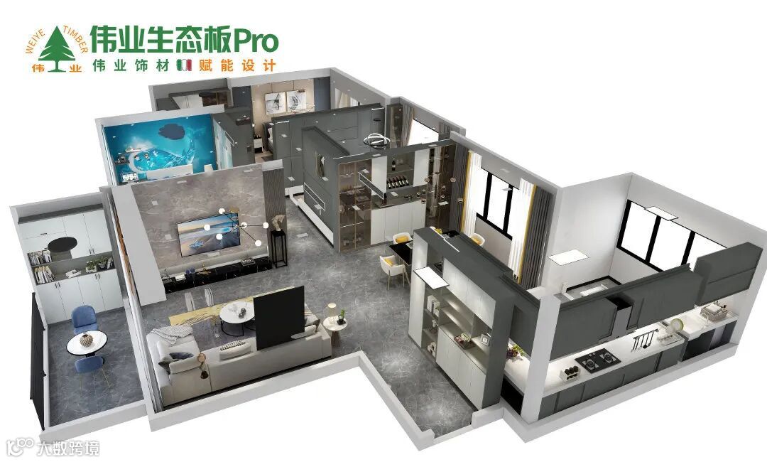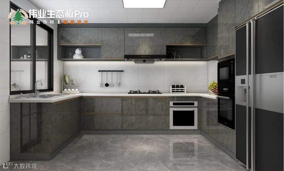 厨房是烟火气最浓的地方,以低调沉稳的灰色为主,6138云石黑-高光设计出U型橱柜,辅以R01锌深灰-染影做内嵌开放格,既合理规划每一寸空间,又解决瓶瓶罐罐的收纳难题,让日常烹饪变成一件享受的事情。