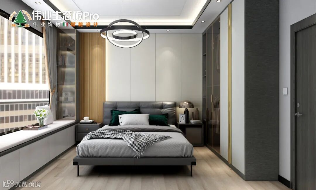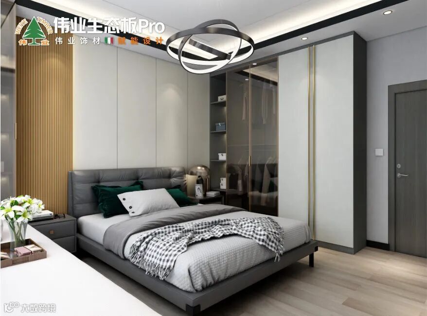 次卧以白色为主,D107白布纹+原木栅格组成床头背景墙,以R01锌深灰-染影为柜身,以211麻石白火烧为柜门,“灰”与“白”的结合,营造理性、优雅的视觉美感,增加玻璃门、单排收纳格设计,以2:3的恰当藏露比例,将实用主义贯彻到底。