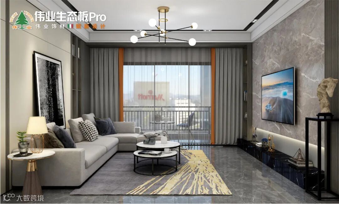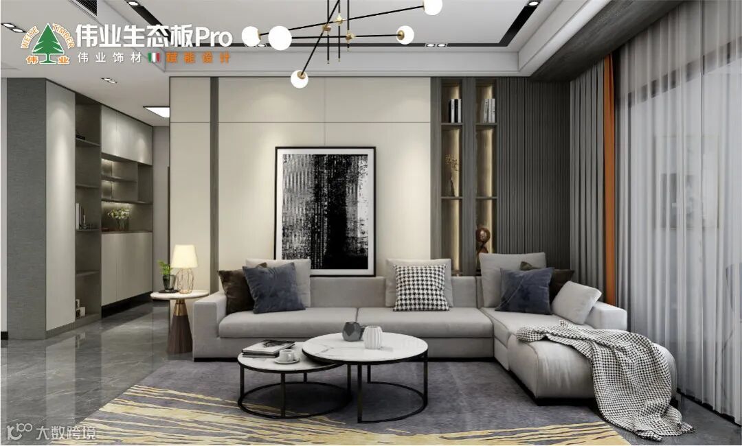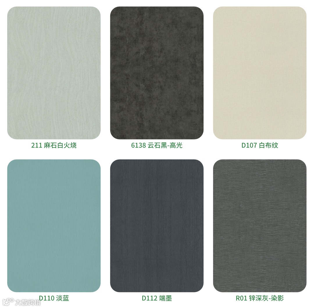 客厅以黑白灰为主,D126罗马梨木、D107白布纹作沙发背景墙,以3:1的比例配色,表达现代风的理性之美,通过不同梯度的色彩,堆叠出丰富的层次感,清晰古典的木纹、柔和细腻的布纹,质感对比强烈,整体空间简洁明净,在简单中营造不同凡响的高级感。