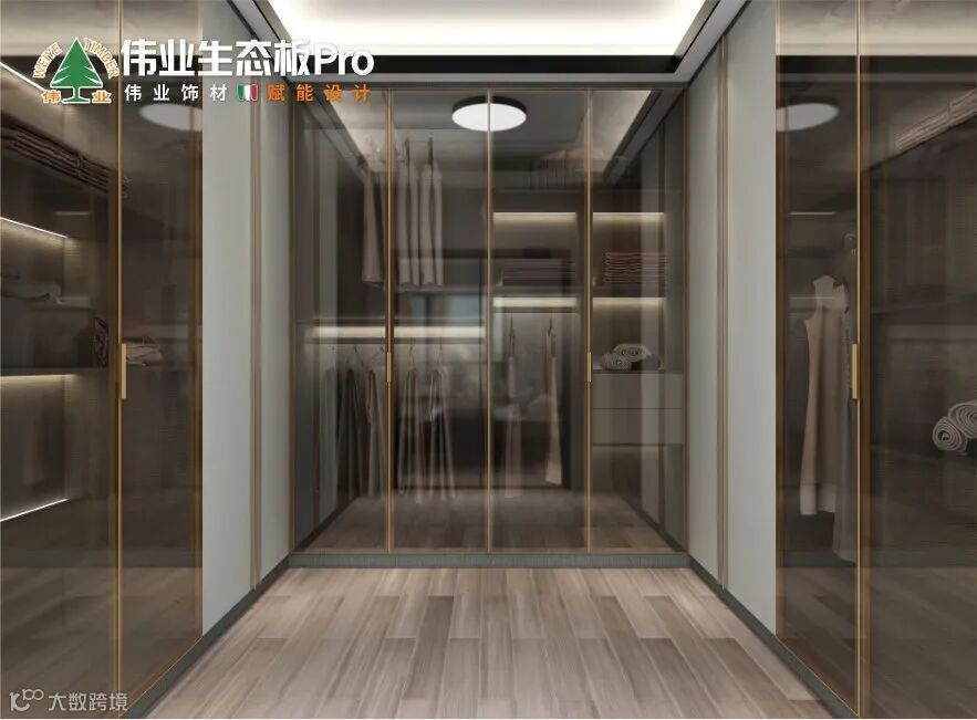 衣帽间利用211麻石白火烧、R01锌深灰-染影,遵循对称的家居美学原则,打造成U型收纳柜,再加上嵌入式灯带、玻璃门,使得空间更加通透明亮,让单薄的空间更有质感。