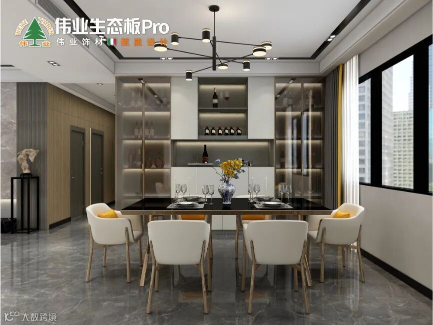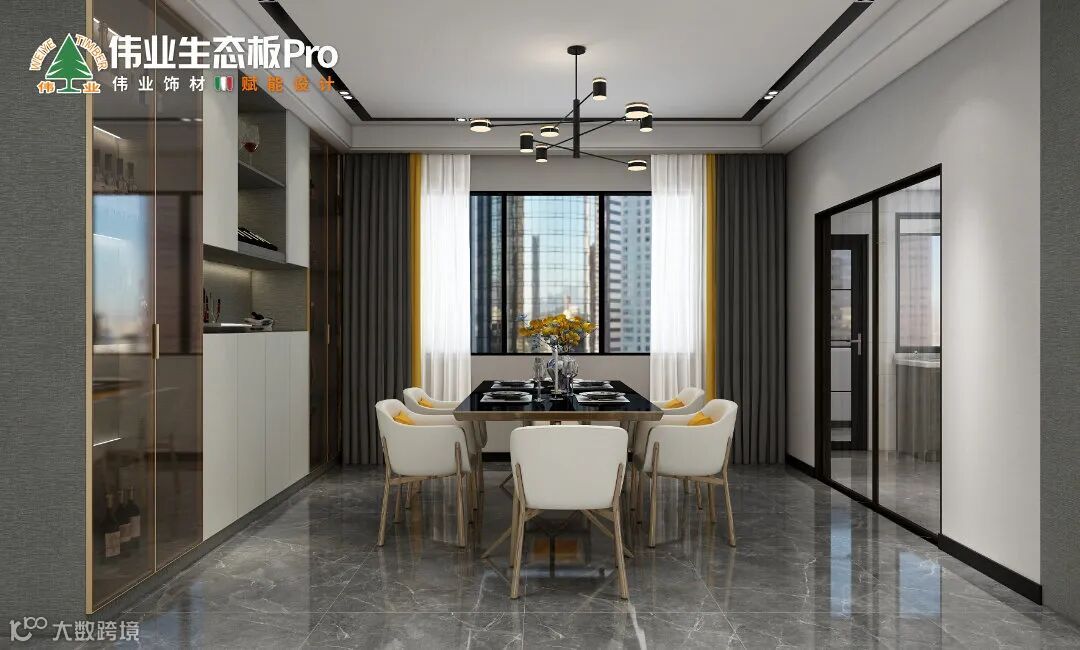 餐厅与客厅一线相连,明亮素雅的211麻石白火烧、纯粹个性的R01锌深灰-染影,共同组成空间主色调,餐边柜的造型简洁,整体没有多余的装饰,强调材料的质地与颜色的搭配效果,突出时尚前卫的格调,让居家烟火气的温馨写意,在餐厅中徐徐弥漫。