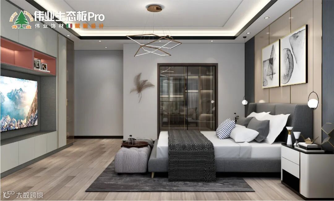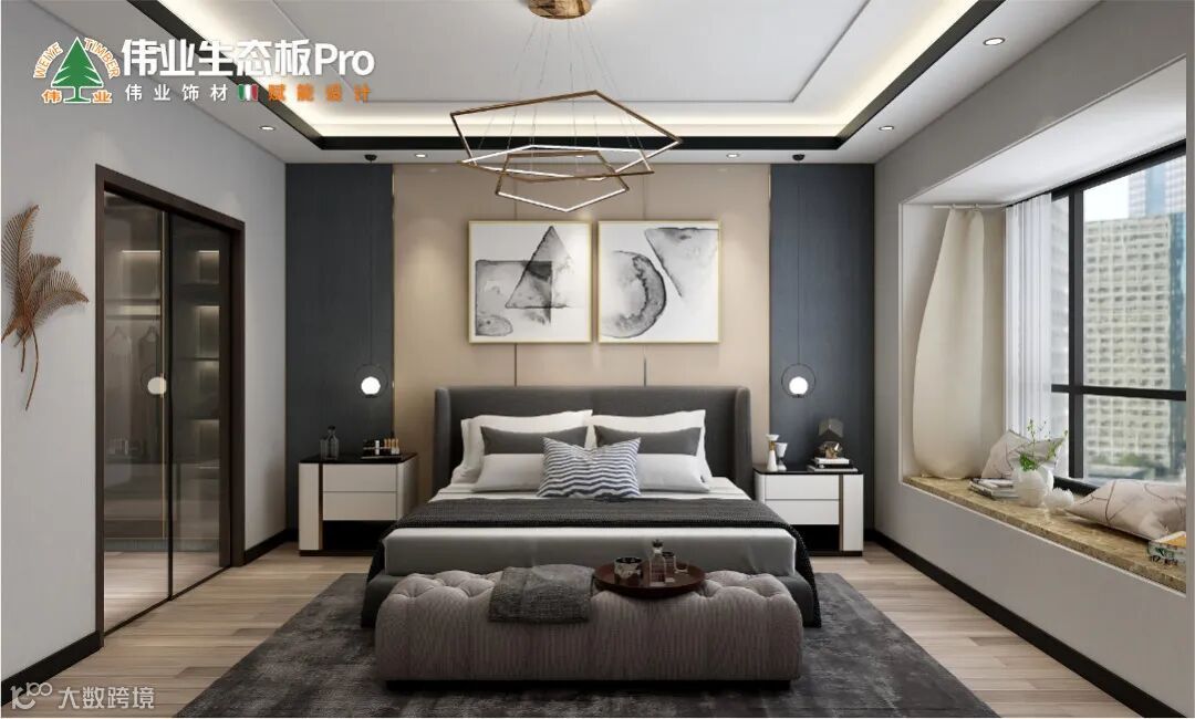 主卧的空间布局以功能化为核心,D112端墨和原木色拼接成床头背景墙,典雅大方,211麻石白火烧和R01锌深灰-染影组合成电视柜,呈现完美的现代质感,并融入粉色收纳格,为卧室增加一抹浪漫的气息。