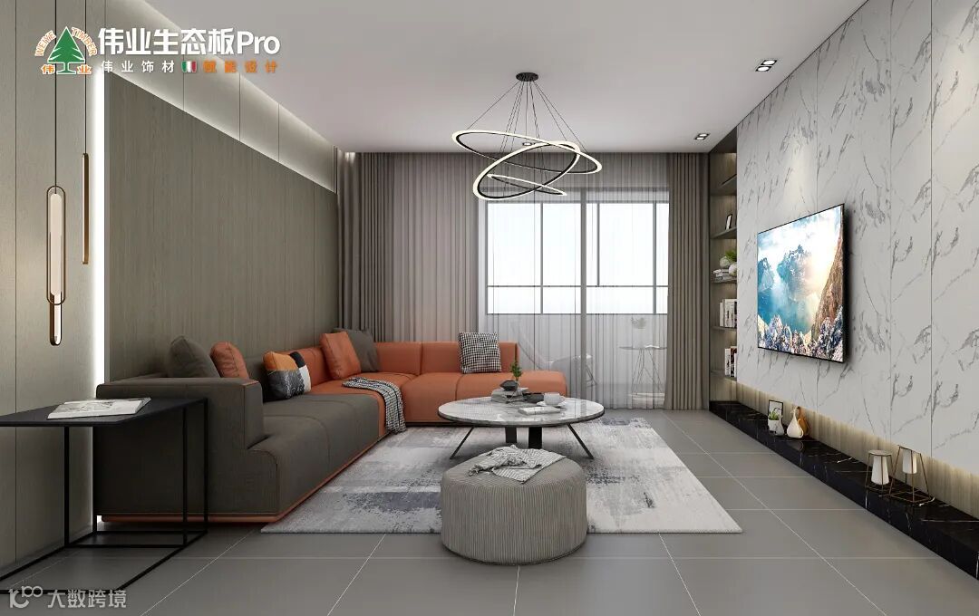 客厅使用213大理白-火烧做电视护墙板,搭配D126罗马梨木的层板收纳格,整体简洁大气,沙发护墙板以D127米兰布纹为底,出跳D120北欧橡木,融入橙色的皮质沙发、黑色的金属边几、造型精致的灯具,为灰白为主的空间增加色彩和温度,起到画龙点睛的效果。