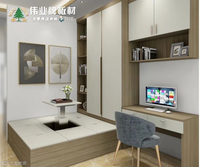 榻榻米一直都是家居行业的爆款,升降型的榻榻米融入收纳柜、书桌等设计,原木柜体与白色柜门的结合,让空间自然舒适,为顾客创造最贴切的家的氛围,既可以作为书房,也还可以当做茶室、客卧来使用。