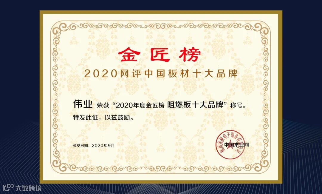 近日,中国木业网主办了“阻燃板十大品牌”评选活动,伟业牌阻燃板一步步构建创新,一次次升级跨越,历经重重考验,在众多品牌中脱颖而出,成功入选“2020年阻燃板十大品牌”榜单!