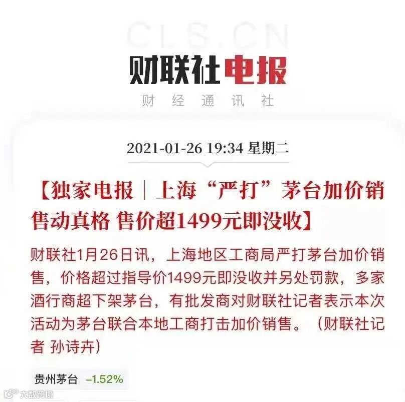 突发:上海“严打”茅台加价销售动,售价超1499元即没收罚款!
