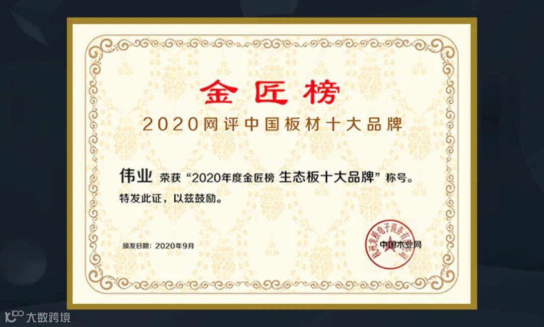 伟业牌生态板围绕“上午安装,下午入住”核心战略,坚持为品质做加法,持续寻找新的突破口,2020年成功推出伟业生态板Pro系列,刷新行业产品格局,在木业网主办的“2020年生态板十大品牌”活动中入选十大品牌榜单。