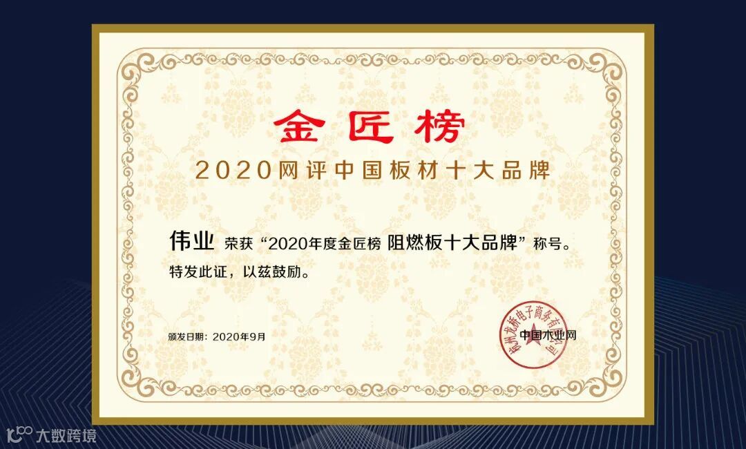 在买购网主办的2020年“阻燃板十大品牌”评选活动中,伟业牌阻燃板坚守初心、坚守社会使命,解决客户痛点与需求,销售网络辐射全国,以强劲的市场竞争力,入选排行榜。
