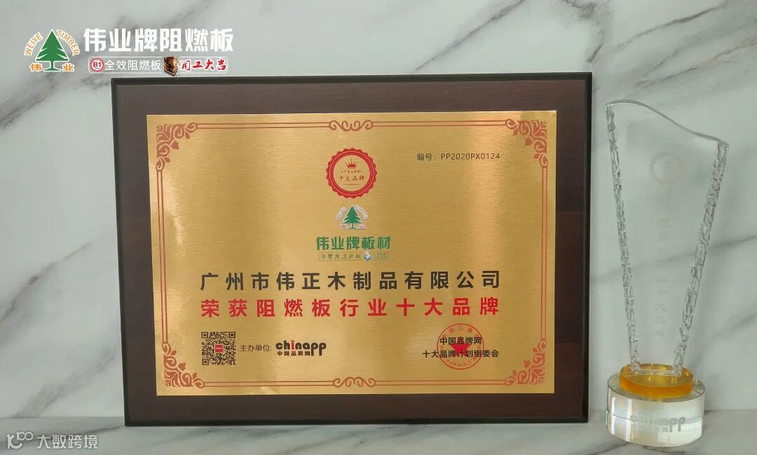 中国木业网主办了“阻燃板十大品牌”评选活动,伟业牌阻燃板经过工艺的不断改进和创新,不断构建创新、升级跨越,历经千锤百炼,具有防火阻燃、防水防潮、绿色环保等性能,成功入选榜单。