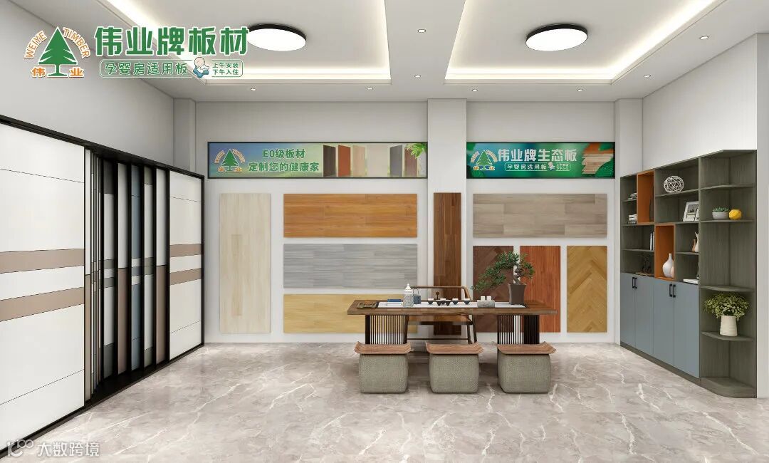 入口进来是一楼板材区,用以展示板材产品,以大板和小板结合的形式,完美呈现伟业牌板材产品的花色纹理与工艺细节,让消费者在展厅行走中,近距离欣赏最新板材花色、触摸产品品质,从而挑出心仪的产品。