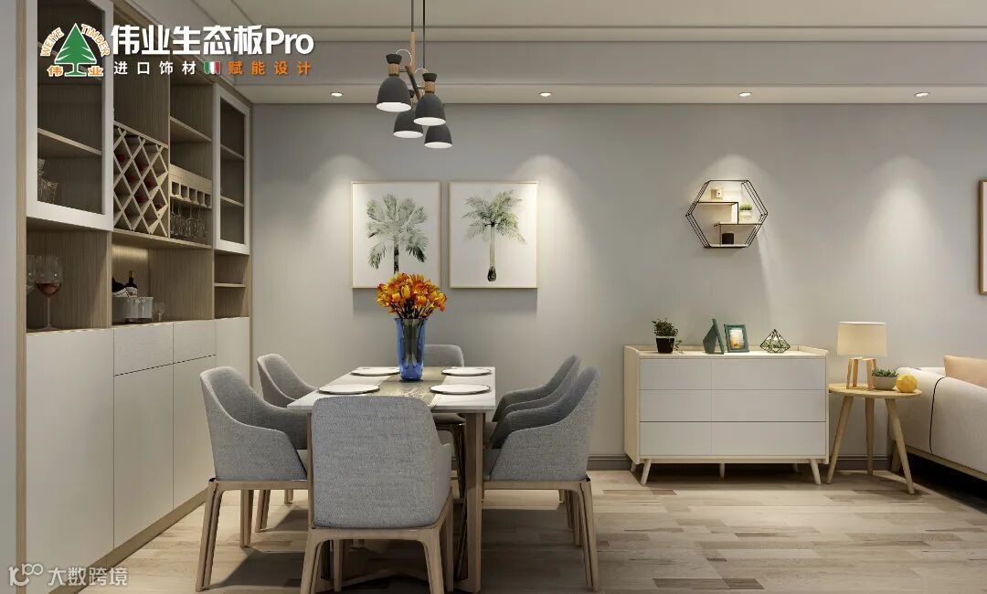 餐厅延续了清新自然的视觉定调,原木风的餐边柜、木质的长形餐桌,搭配轻巧的餐椅,自然的木纹、柔和的光泽、温润的触感,加上吊灯、花束的点缀,让用餐的氛围更加温暖。