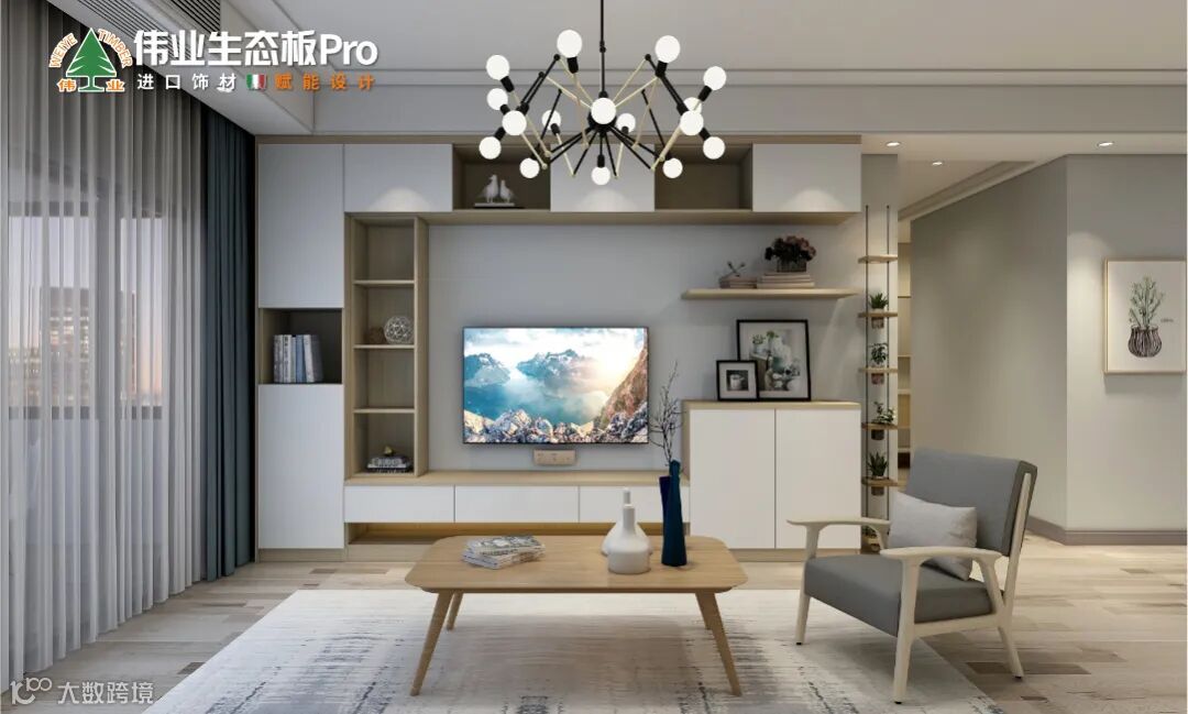 客厅打造整墙电视柜,封闭收纳柜+开放展示柜,既能起到装饰作用,又能解决收纳问题,搭配原木风的茶几、沙发,融入挂画、抱枕、绿植,舒适自然,仿佛所有的疲倦都能在这里找到出口。