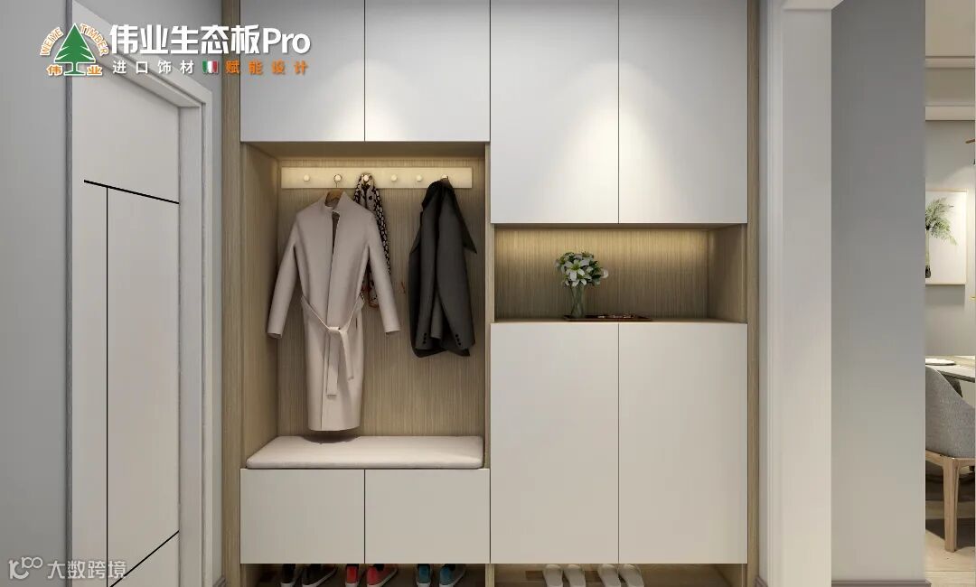 进门一侧打造多功能玄关柜,遵循删繁就简的原则,白色+原木的色彩搭配、直截了当的功能分区,呈现北欧风简洁、高级的特征,每一次归家都卸下工作的烦恼与焦躁,走进温馨的家。