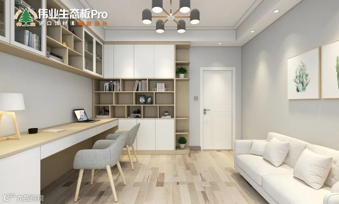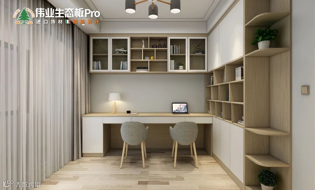 原木的柜体、白色的掩门,组成了一体化书柜,采用半开放的设计,形成错落有致的收纳空间,从书柜延伸出一字型书桌,置上双人椅子,打造双人办公区,满足家庭办公需求。